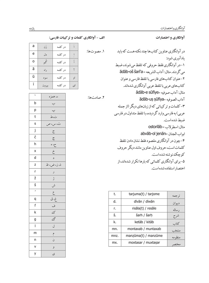 [Robā'īyāt-e bābā tāher], slew Giliolusi (qasīde-ye bānat so‘ād], --solusi (qasīde-ye borde]. 1-3. Words like “wallw)...” [resāle dar ... / an essay on ...] or “ulis...” [ketāb-e .../ Book of ...] have been deleted from the beginning of the name of book and have been put at the end of title inside (). 1-4. This rule is followed similarly in the case of words such as “usijo” [moxtasar /