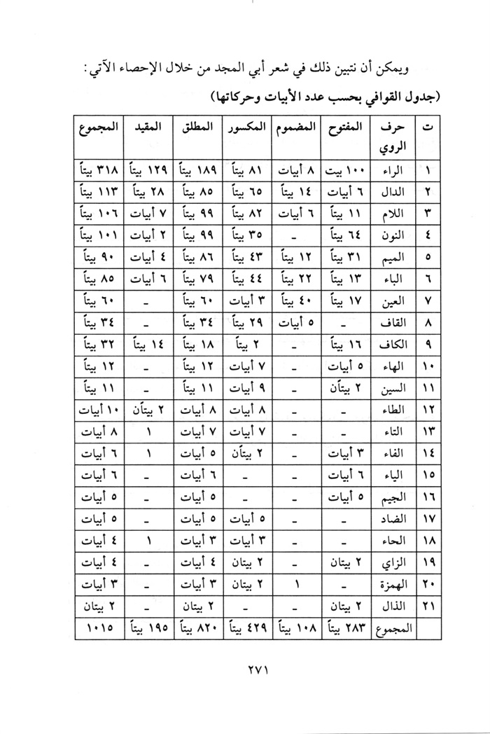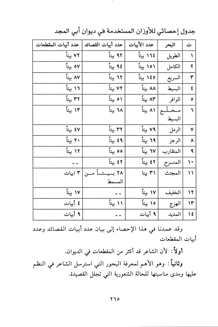 جدول إحصائي للأوزان المستخدمة في ديوان أبي المجد....265