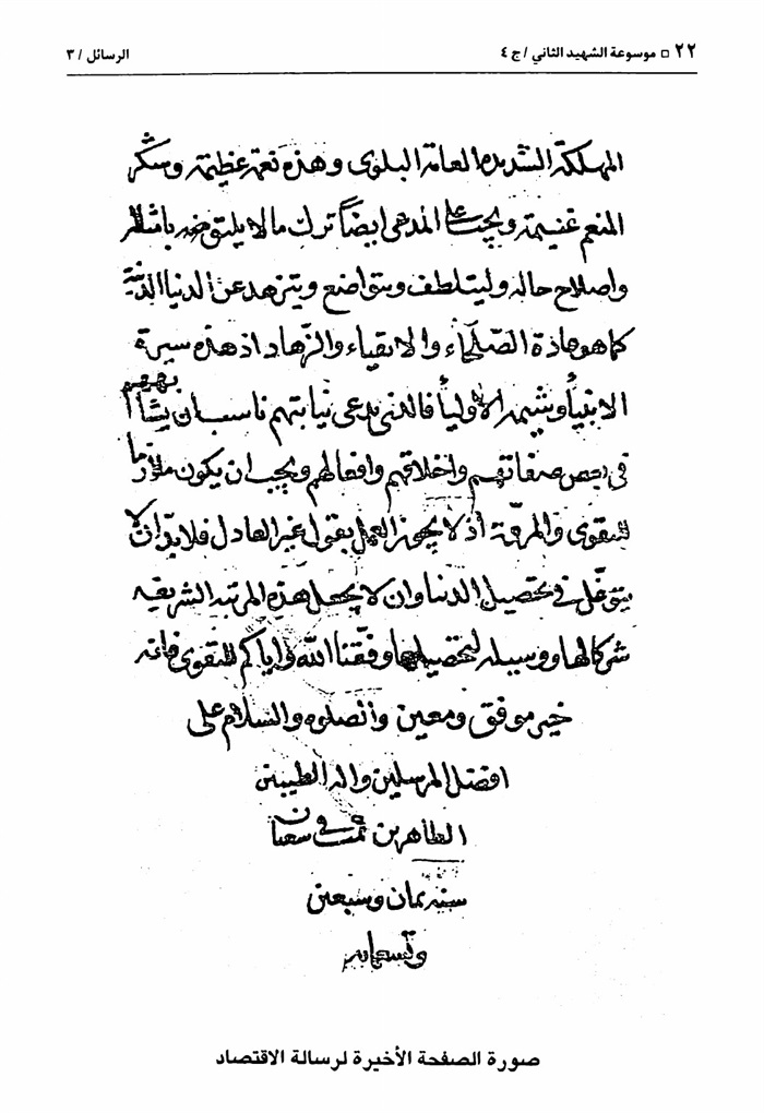 الجزء الرابع = (31 - 43) الرسائل /3 : 31 .تفسير آية البسملة؛ 32. الإسطنبولية في الواجبات العينية ؛ 33. الاقتصاد والإرشاد إلى طريق الاجتهاد؛ 34.وصيّةً نافعة؛ 35 .شرح حديث«الدنيا مزرعة الآخرة»؛ 36 .تحقيق الإجماع في زمن الغَيْبَة؛ 37 .مخالفة الشيخ الطوسي (رحمه الله) لإجماعات نفسه؛ 38 .ترجمة الشهيد بقلمه الشريف ؛39. حاشية خلاصة الأقوال»؛ 40. حاشية «رجال ابن داود»؛ 41. الإجازات؛ 42. الإنهاءات والبلاغات ؛43 الفوائد.
