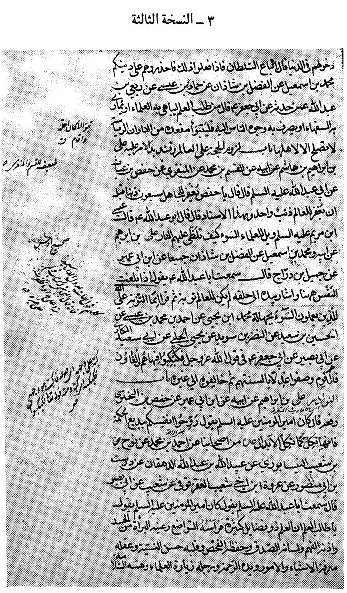 و قد کان علماء الشیعة، و رواة أخبار آل محمّد،- و لا یزالون- یتوارثون العنایة بروایة الحدیث، و حمله، و نقده، و جمعه، و ترتیبه، و فنون درایته (3)، و تعدیل رواته؛ و تحقیق تواریخ و طبقات رجاله (4)، و إجازاتهم المبسوطة، فی هذا الباب، جمّة؛ و قد بلغ بعضها مقدار بعض مجلّدات، أمّا المقتضبة؛ فأشتات کثیرة لا تحصی، قیّدت طائفة منها فی مجموعات مشهورة، حافلة بالفوائد و النوادر (5).