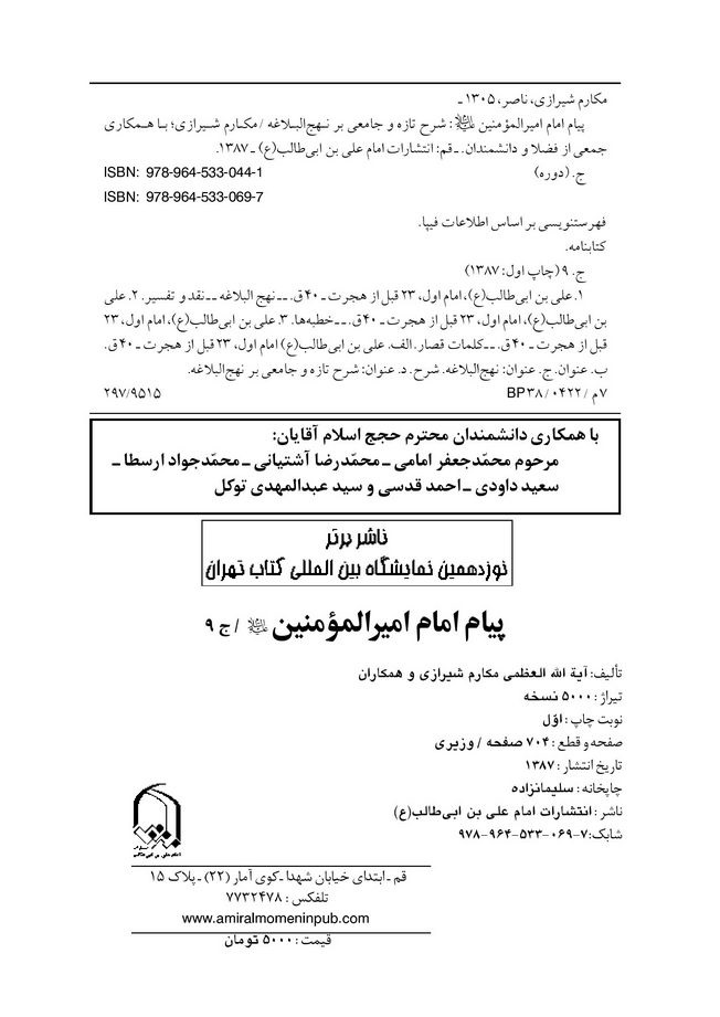 موضوع:علی بن ابی طالب (ع)، امام اول، 23 قبل از هجرت - 40ق. . نهج البلاغه -- نقد و تفسیر