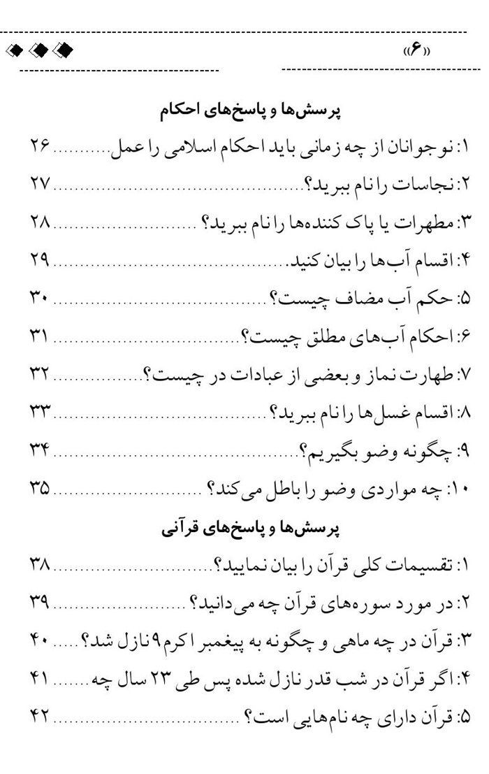 آنچه در پیش رو دارید مجموعه چهل پرسش نوجوانان در قالب موضوعات اسلامی دسته بندی و به زبان ساده و روان پاسخ داده شده است، تا نوجوانان شیفته معارف اسلامی از آن بهره وافر و استفاده لازم را ببرند.