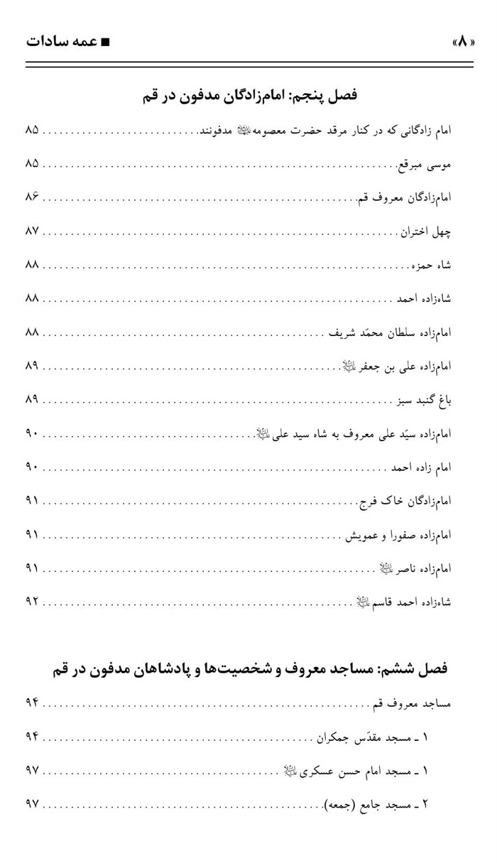 امام زادگان دیگری نیز در قم و اطراف قم وجود دارند که شرح حال آن ها در کتاب های زیر آمده است که علاقه مندان می توانند به آن ها مراجعه نمایند.