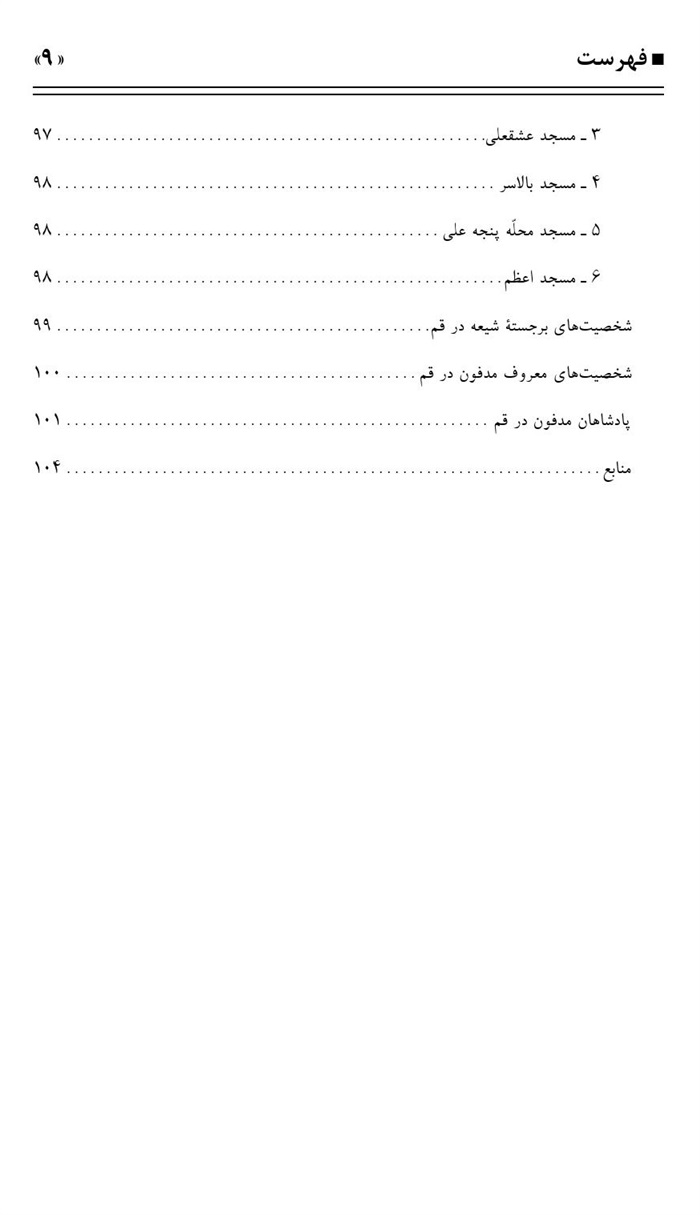 مختار البلاد در تاریخ قم تألیف ناصرالشریعه، راهنمای قم تألیف آقای برقعی گنجینه آثار قم تألیف آقای عباس فیض، ترجمه تاریخ قم و باب الرضوان فی مناقب سلطان خراسان.