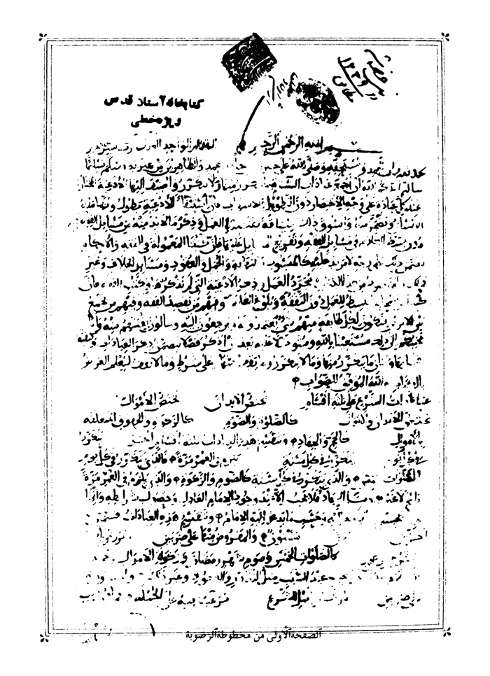 وَ قَالَ النَّبِيُّ صَلَّى اللَّهُ عَلَيْهِ وَ آلِهِ (3)لِعَلِيٍّ عَلَيْهِ السَّلاَمُ (4) تَعَلَّمْهَا أَنْتَ وَ عَلِّمْهَا أَهْلَ بَيْتِكَ وَ شِيعَتَكَ (5) قَالَ وَ قَالَ النَّبِيُّ عَلَيهِ وَ آلِهِ السَّلامُ عَلَّمَنِيهَا جِبْرِيلُ (6)نُسْخَةُ الْكِتَابِ الَّذِي يُوضَعُ عِنْدَ الْجَرِيدَةِ مَعَ الْمَيِّتِ يَقُولُ قَبْلَ أَنْ يَكْتُبَ - بِسْمِ اللّهِ الرَّحْمنِ الرَّحِيمِ أَشْهَدُ أَنْ لاَ إِلَهَ إِلاَّ اللَّهُ وَحْدَهُ لاَ شَرِيكَ لَهُ وَ أَشْهَدُ أَنَّ مُحَمَّداً عَبْدُهُ وَ رَسُولُهُ صَلَّى اللَّهُ عَلَيْهِ وَ آلِهِ وَ أَنَّ اَلْجَنَّةَ حَقٌّ وَ أَنَّ اَلنَّارَ حَقٌّ - وَ أَنَّ السّاعَةَ آتِيَةٌ لا رَيْبَ فِيها وَ أَنَّ اللّهَ يَبْعَثُ مَنْ فِي الْقُبُورِ ثُمَّ يُكْتَبُ بِسْمِ اللّهِ الرَّحْمنِ الرَّحِيمِ شَهِدَ الشُّهُودُ الْمُسَمَّوْنَ فِي هَذَا الْكِتَابِ أَنَّ أَخَاهُمْ فِي اللَّهِ عَزَّ وَ جَلَّ فُلاَنَ بْنَ فُلاَنٍ وَ يَذْكُرُ اسْمَ الرَّجُلِ أَشْهَدَهُمْ وَ اسْتَوْدَعَهُمْ وَ أَقَرَّ عِنْدَهُمْ أَنَّهُ يَشْهَدُ أَنْ لاَ إِلَهَ إِلاَّ اللَّهُ وَحْدَهُ لاَ شَرِيكَ لَهُ وَ أَنَّ مُحَمَّداً صَلَّى اللَّهُ عَلَيْهِ وَ آلِهِ عَبْدُهُ ج.