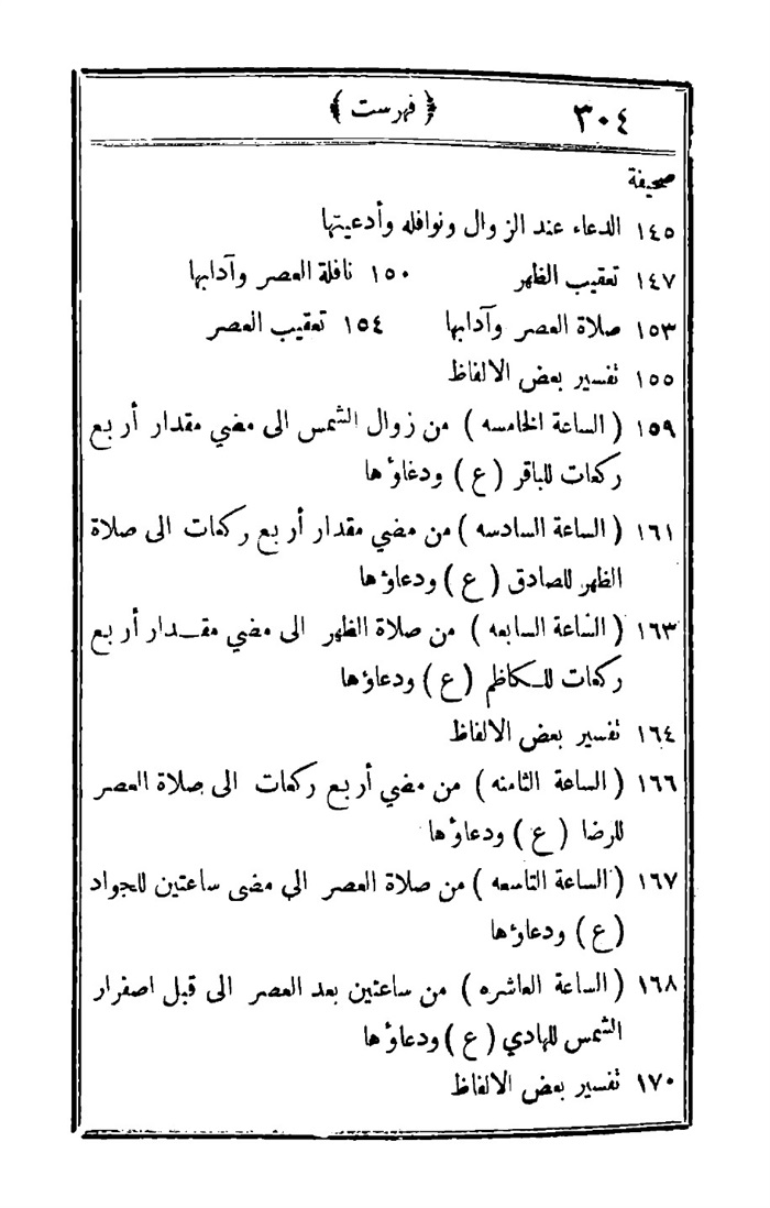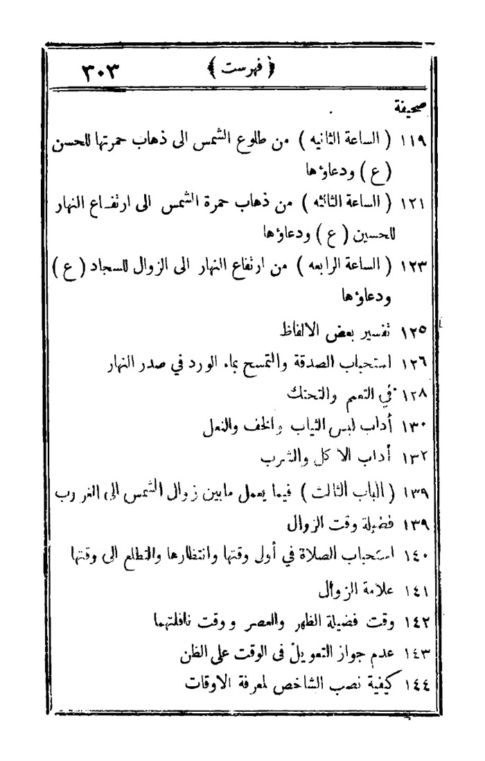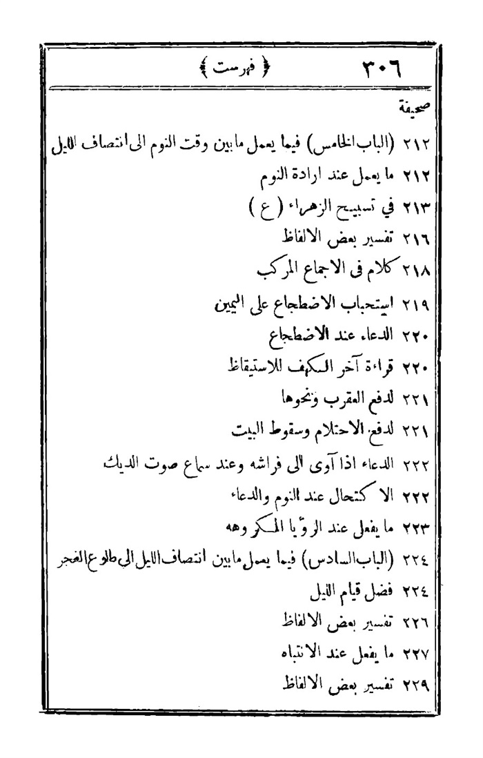 الذخائر ليوم الدين (ورتبته) على ستة أبواب متوكلا على ملهم الصواب في كل باب (الباب الأول) فيما يعمل ما بين طلوع الفجر إلى طلوع الشمس (الباب الثاني) فيما يعمل ما بين طلوع الشمس إلى الزوال (الباب الثالث) فيما يعمل ما بين المغرب إلى وقت النوم (الباب الخامس) فيما يعمل ما بين وقت النوم إلى انتصاف الليل (الباب السادس) فيما يعمل ما بين انتصاف الليل إلى طلوع الفجر الباب الأول فيما يعمل ما بين طلوع الفجر إلى طلوع الشمس وفيه مقدمة وفصول مقدمة قد ورد عن أصحاب العصمة سلام الله عليهم في فضيلة هذا الوقت روايات عديدة ويطلق عليه ساعة الغفلة كما يطلق ذلك على ما بين غروب الشمس وذهاب الشفق أيضا وينبغي أن يكون الإنسان فيه متيقظا فإن النوم في ذلك الوقت شوم (روى) رئيس المحدثين في الفقيه عن الباقر عليه السلام أنه قال نومة الغداة مشؤمة تطرد الرزق وتصفر