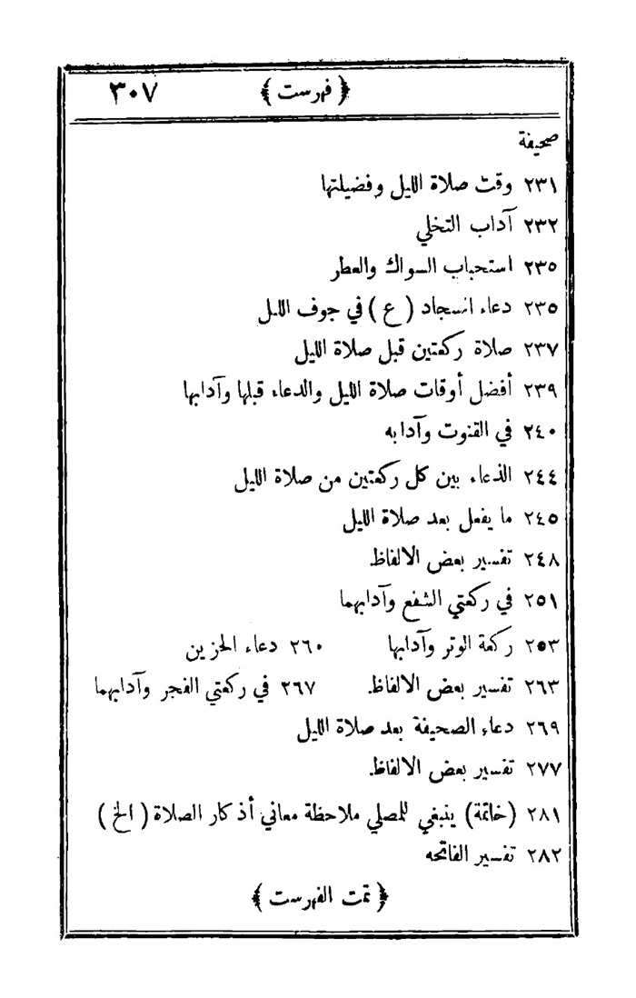 مغمورة في صفات الرحمة والغفران ولنقطع الكلام على لفظي الرحمة والغفران سائلين منه (جل شأنه) أن يغمرنا برحمته وغفرانه ويعاملنا بعفوه وجوده وامتنانه وأن يوفقنا وسائر الأخوان للمواظبة على العمل بما تضمنه هذا الكتاب وأن يجعله من أحسن الذخائر ليوم الحساب ونتوسل إليه سبحانه بسيد المرسلين وأشرف الأولين والآخرين وعترته الأئمة الطاهرين صلوات الله عليه وعليهم أجمعين أن لا يردنا عن بابه خائبين وأن لا يؤاخذنا بسوء أعمالنا يوم الدين إنه أرحم الراحمين وأكرم الأكرمين وسلم تسليما كثيرا (برحمتك يا أرحم الراحمين) * * * فرغت بعون الله من تأليفه مع تراكم أفواج العلائق وتلاطم أمواج العوائق وتوزع البال بالحل والترحال في أوائل العشر الثالث من الشهر الثاني من السنة الخامسة من العشر الثاني بعد الألف ببلدة (كنجه) وأنا أقل الأنام محمد المشتهر ببهاء الدين العاملي تجاوز الله عن سيئاته والحمد لله أولا وآخرا وظاهرا وباطنا وكان الفراغ من طبعه في يوم الخميس 15 من شهر ربيع الثاني سنة 1324 هجرية على صاحبها أفضل الصلاة وأزكى التحية