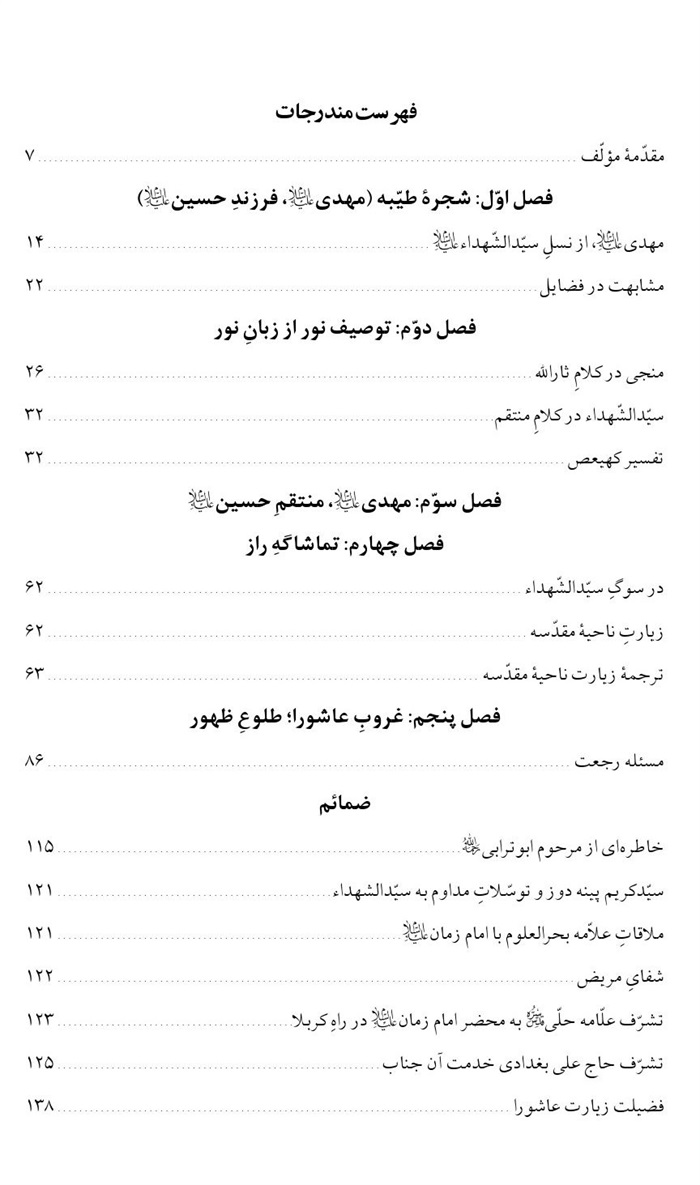 در ابتدا نیم نگاهی به روایاتی خواهیم داشت که بیانگرِ امتدادِ شجره طیّبه امامت و خلافتِ الهی از نسلِ سیّدالشّهداء به امام حسن عسکری علیه السلام است. در فصلِ دوّم، کلامِ دو امام را با تأمّلی دوباره، کاوش نموده و آنچه در بیانِ ایشان، به هم مربوط بودند، جدا نمودیم. در فصل سوّم، ندایِ «این الطّالب بدم المقتول بکربلا» را باری دیگر به تحلیل نشستیم و در فصلِ چهارم، حضور و ظهورِ منجی در کربلا و امتدادِ این راه را به گفتگو نشسته و بالاخره در فصلِ پنجم به توصیفِ طلوعِ زیبای مهدویّت و حضورِ سالارِ آزادگانِ جهان می پردازیم که شاید به حلوا گفتن، دهانی شیرین نموده و ضرب المثل «وصف العیش، نصف العیش» را عینیّتی بخشیده باشیم....