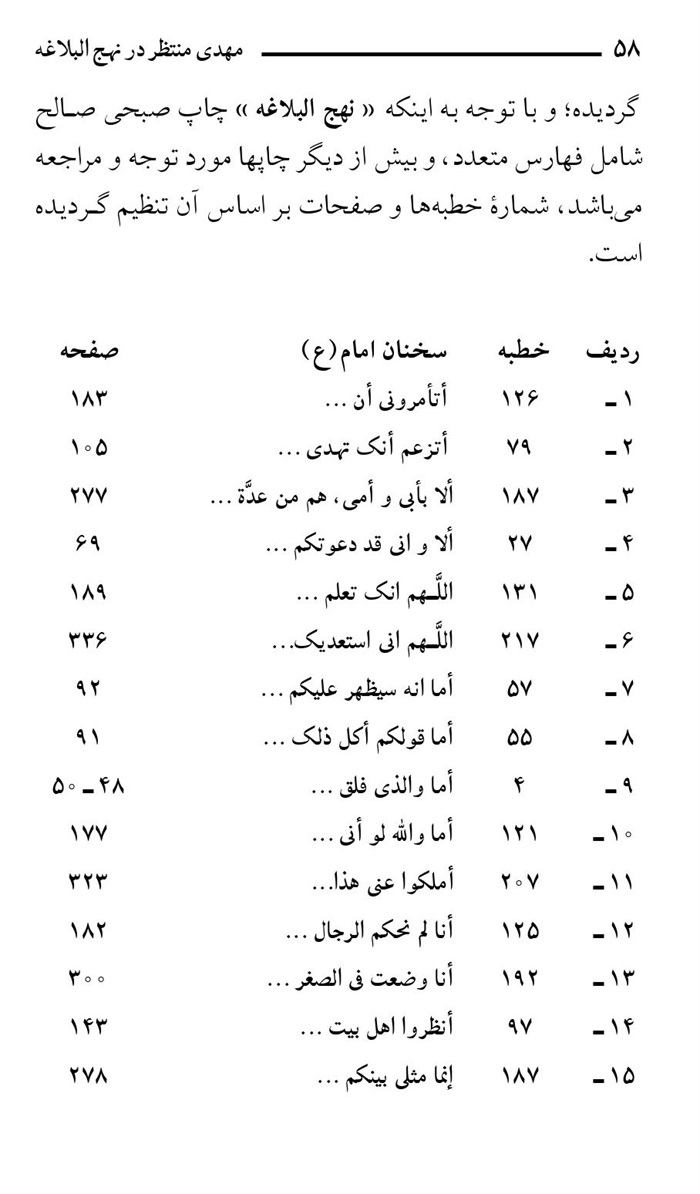 در پایان ، با توجه به شماره مسلسل این خطبه ، شایسته بود این فراز را قبل از دیگر فرازهای مربوط به حضرت مهدی(علیه السلام) مطرح کنیم ، لکن چون در متن « نهج البلاغه » ذکر نشده بود ، و از جهتی خارج از موضوع کتاب بود ، در اینجا به ذکر آن پرداختیم. و آخرُ دَعوانا أن الحمد للّه رب العالمین اصفهان ربیع الثانی 1403 مهدی فقیه ایمانی (205)