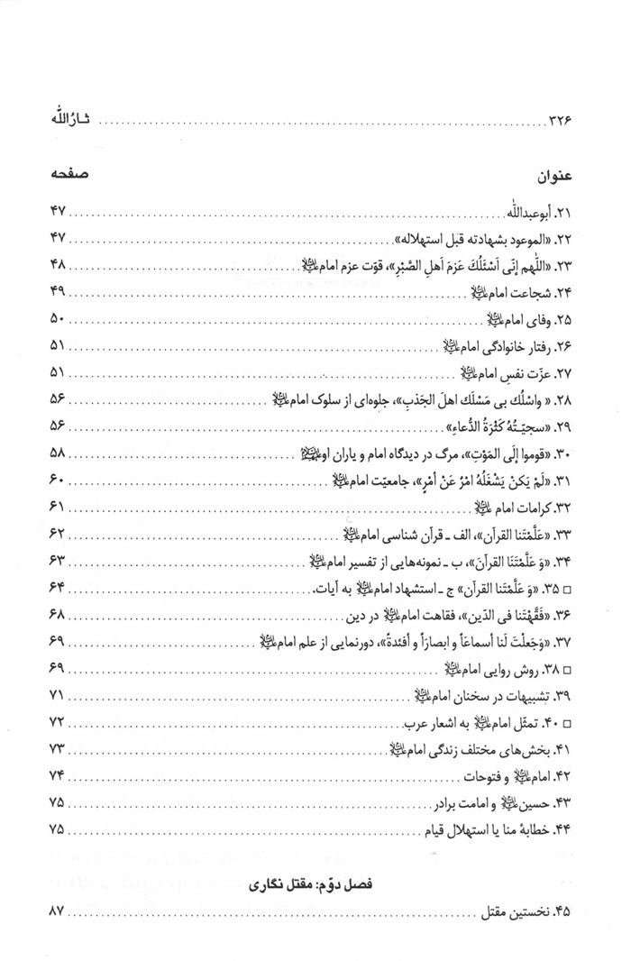 294 پژوهشی پیرامون زندگاهی امام حسین علیه السلام: محمد مهدی شمس الدین، ترجمه هدی پیشوایی. 295 پیام آور عاشورا: عطاء الله مهاجرانی.
