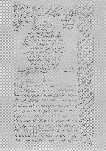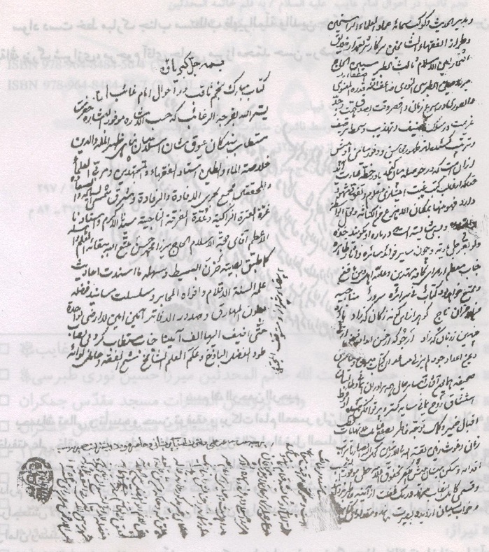 واهله کما طبّق بصیّته حزن البسیط و سهله ما اسندت احادیث علمه السنة الاقلام و افواه المحابر و سلسلة مسانید فضله بطون المهارق وصدور الدفاتر آمین آمین لا ارض بواحدة حتّی تضیف الیها الف آمینا جناب مستطاب کرّوبی نصاب طود الفضل الباذخ و علم العلم الشامخ شیخ الفقه و حامل لوائه و مدیر الحدیث و کوکب سمائه عماد العلماء الراسخین و طراز الفقهاء الشامخین سرکار شریعت مدار خلایق افتخار امین الاسلام ثالث الطبرسیّین الحاج میرزا حسین الطبرسی النوری ضاعف اللَّه قدرة المعنوی والسوری در اسرع زمان واقصر وقت به صدق همّت و جدّ عزیمت در سلک تصنیف و تهذیب و سمط ترصیف و ترتیب کشیده اند ظهور محاسن و وفور میامن او بیش از آن است که در حوصله بیان گنجد یا در خطّه عبارت آید حقّا که از غالب کتب غیبت امتیازی معلوم و تفوّقی مشهود دارد. «فهومنها بمکان الاهزع منه الکنانه و محل الواسطة من القلادة.»