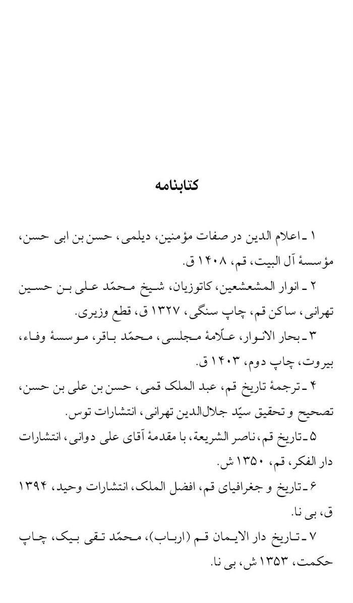 این تذکر لازم است که گزارش این سه شخصیت به کتاب ترجمه تاریخ قدیمی قم، که اصل آن تألیف حسن بن محمدبن حسن قمی - معاصر شیخ صدوق - است، منتهی می گردد. این کتاب در سال {1378} قمری تدوین و در سال {806 - 805} توسط بهاءالدین حسن بن علی بن حسن بن عبدالملک قمی، در بیست باب، به