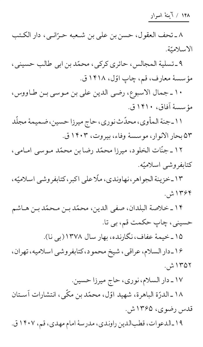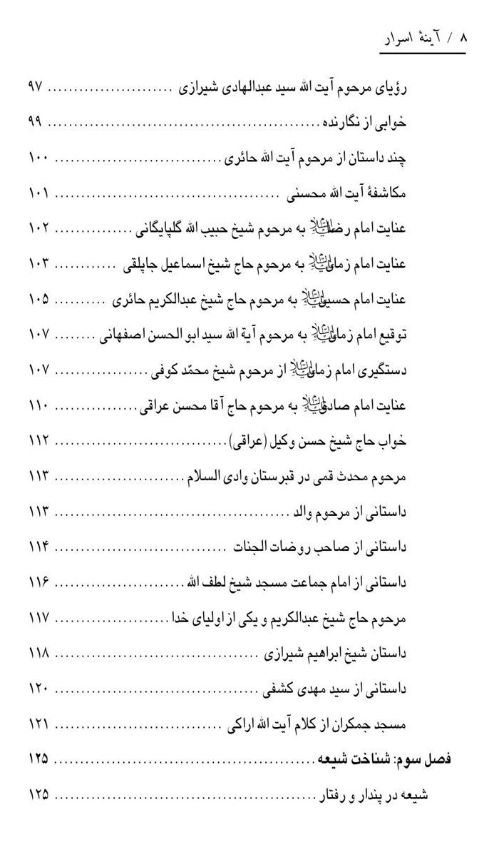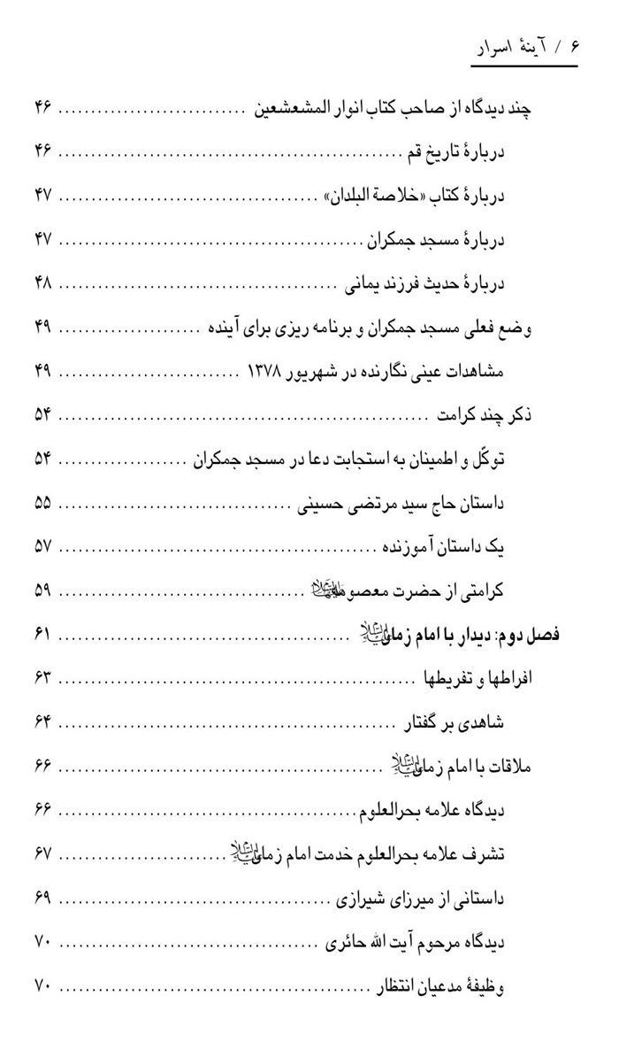 این اثر را در سه فصل تنظیم نمودم. فصل اول درباره حدیث مسجد جمکران و آنچه مربوط به آن مکان مقدّس است. فصل دوم درباره ملاقات با امام زمان علیه السلام ارواحنا فداه در زمان غیبت کبری و آنچه مناسب آن (1) می باشد. در فصل سوم اشاره ای به رفتار و پندار شیعه می شود و نام آن را آینه اسرار قرار دادم. در هر حال از محضر آن خاتم اوصیا و امید اولیا، یوسف فاطمه زهرا، مهدی موعود حجةبن الحسن العسکری (ارواحنا فداه) تقاضای دستگیری و از علاقه مندانی که موفق به خواندن این کتاب می شوند امید عذر پذیری را دارم.