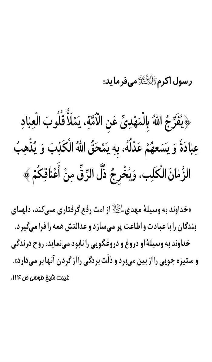 (یفَرِّجُ اللَّهُ بِالْمَهْدِی عَنِ الْاُمَّةِ، یمْلَأُ قُلُوبَ الْعِبادِ عِبادَةً وَ یسَعهُمْ عَدْلُهُ، بِهِ یمْحَقُ اللَّهُ الْکَذِبَ وَ یذْهِبُ الزَّمانَ الْکَلِب، وَیخْرِجُ ذُلَّ الرِّقِّ مِنْ أَعْناقِکُمْ)