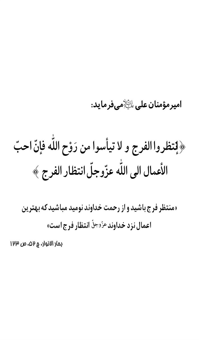 (إنتظروا الفرج و لا تیأسوا من رَوْح اللّه فإنّ احبّ الأعمال الی اللّه عزّوجلّ انتظار الفرج)