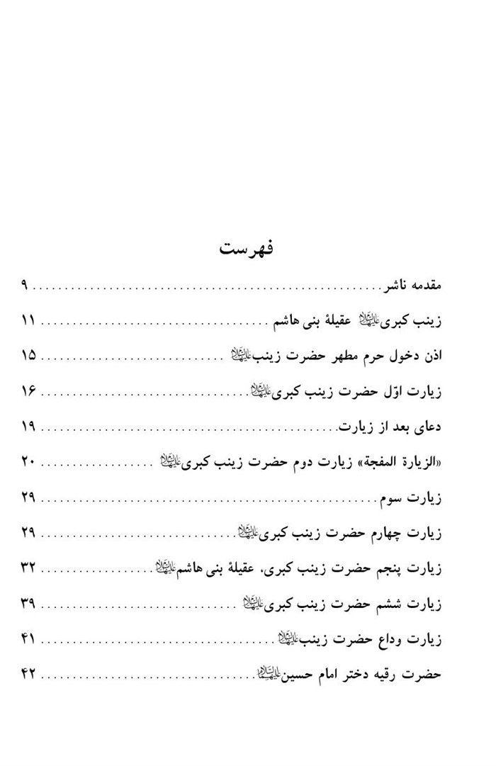 عَلَیْکِ یا بِنْتَ عَلِیٍ ّ الْمُرْتَضی اَلسَّلامُ عَلَیْکِ یا بِنْتَ سَیِّدِ الْأَوصِیآءِ وَالصِّدِّیقِینَ، اَلسَّلامُ عَلَیْکِ یا بِنْتَ فاطِمَةَ الزَّهْرآءِ سَیِّدَةِ نِسآءِ الْعالَمِینَ، اَلسَّلامُ عَلَیْکِ یا أُخْتَ الْحَسَنِ وَالْحُسَیْنِ سَیِّدَیْ شَبابِ أَهْلِ الْجَنَّةِ أَجْمَعِینَ، اَلسَّلامُ عَلَیْکِ اَیَّتُهَا السَّیِّدَةُ الزَّکِیَّةُ، اَلسَّلامُ عَلَیْکِ أَیَّتُهَا الدّاعِیةُ الْحَفِیَّةُ، اَلسَّلامُ عَلَیْکِ أَیَّتُهَا التَّقِیَّةُ النَّقِیَّةُ، اَلسَّلامُ عَلَیْکِ اَیَّتُهَا الرَّضِیَّةُ الْمَرْضِیَّةُ، اَلسَّلامُ عَلَیْکِ أَیَّتُهَا اَلْعالِمَةُ الْغَیْرُ الْمُعَلَّمَةِ، اَلسَّلامُ عَلَیْکِ اَیَّتُهَا الْفَهِیمَةُ الْغَیْرُ الْمُفَهَّمَةِ، اَلسَّلامُ عَلَیْکِ اَیَّتُهَا الْمَظْلُومَةُ، اَلسَّلامُ عَلَیْکِ اَیَّتُهَا الْمَهْمُومَةُ، اَلسَّلامُ عَلَیْکِ اَیَّتُهَا الْمَغْمُومَةُ، اَلسَّلامُ عَلَیْکِ اَیَّتُهَا الْمَضْرُوبَةُ، اَلسَّلامُ عَلَیْکِ اَیَّتُهَا الْمَأْسُورَةُ، اَلسَّلامُ عَلَیْکِ اَیَّتُهَا الصِّدِّیقَةُ الصُّغْری اَلسَّلامُ عَلَیْکِ اَیَّتُهَا الْعِصْمَةُ الصُّغْری اَلسَّلامُ عَلَیْک یا صاحِبَةَ الْمُصِیبَةِ الْعُظْمی اَلسَّلامُ عَلَیْکِ یا زَیْنَبُ الْکُبْری اَشْهَدُ اَنَّکِ کُنْتِ صابِرَةً