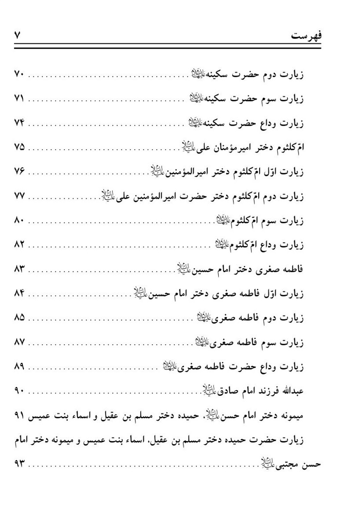 الْجَنَّةِ، اَلسَّلامُ عَلَیْکَ یا عَلِیَّ بْنَ الْحُسَیْنِ سَیِّدَ الْعابِدِینَ وَقُرَّةَ عَیْنِ النّاظِرِینَ، اَلسَّلامُ عَلَیْکَ یا مُحَمَّدَ بْنَ عَلِیٍّ باقِرَ الْعِلْمِ بَعْدَ النَّبِیِّ، اَلسَّلامُ عَلَیْکَ یا جَعْفَرَ بْنَ مُحَمَّدٍ الصّادِقَ الْبآرَّ الْأَمِینَ، اَلسَّلامُ عَلَیْکَ یا مُوسَی بْنَ جَعْفَرٍ الطّاهِرَ الطُّهْرَ، اَلسَّلامُ عَلَیْکَ یا عَلِیَّ بْنَ مُوسَی الرِّضَا الْمُرْتَضی اَلسَّلامُ عَلَیْکَ یا مُحَمَّدَ بْنَ عَلِیٍّ التَّقِیَّ، اَلسَّلامُ عَلَیْکَ یا عَلِیَّ بْنَ مُحَمَّدٍ النَّقِیَّ النّاصِحَ الْأَمِینَ، اَلسَّلامُ عَلَیْکَ یا حَسَنَ بْنَ عَلِیٍّ، اَلسَّلامُ عَلَی الْوَصِیِّ مِنْ بَعْدِهِ. اَللَّهُمَّ صَلِّ عَلی نُورِکَ وَسِراجِکَ، وَوَلِیِّ وَلِیِّکَ وَوَصِیِّ وَصِیِّکَ، وَحُجَّتِکَ عَلی خَلْقِکَ. اَلسَّلامُ عَلَیْکِ یا بِنْتَ رَسُولِ اللَّهِ، اَلسَّلامُ عَلَیْکِ یا بِنْتَ فاطِمَةَ وَخَدِیجَةَ، اَلسَّلامُ عَلَیْکِ یا بِنْتَ أَمِیرِالْمُؤْمِنِینَ، اَلسَّلامُ عَلَیْکِ یا اُخْتَ الْحَسَنِ وَالْحُسَیْنِ، اَلسَّلامُ عَلَیْکِ یا بِنْتَ وَلِیِّ اللَّهِ، اَلسَّلامُ عَلَیْکِ یا أُخْتَ وَلِیِّ اللَّهِ، اَلسَّلامُ عَلَیْکِ یا عَمَّةَ وَلِیِّ اللَّهِ وَرَحْمَةُ اللَّهِ وَبَرَکاتُهُ، اَلسَّلامُ عَلَیْکِ عَرَّفَ اللَّهُ بَیْنَنا وَبَیْنَکُمْ فِی الْجَنَّةِ،