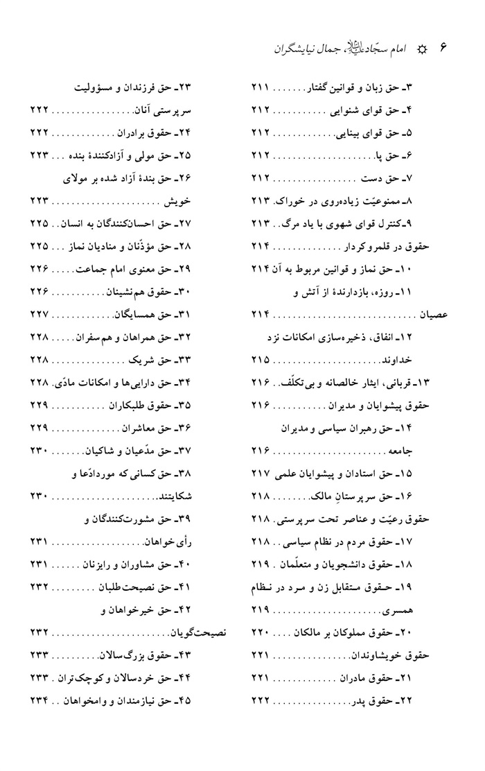 دشمنان ولایت بر خاندان عصمت رفته بود، دوباره مجسم می گردید در نوای گرم دعا هایش پیام توحیدی رسول خدا (ص) و صلایت امیر المومنین و رنجهای حسن بن علی ((علیه السلام)) و مظلومیتهای حسین ((علیه السلام))، سالار شهیدان کربلا، موج می زد در عصر حقوق پایمال شده انسانیت و شرافت و دیانت، رساله حقوق آن گرامی، مایه پند و درس آموزی همه آنان شد که تا همیشه تاریخ در اندیشه تدوین حقوق انسانند.