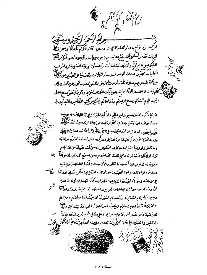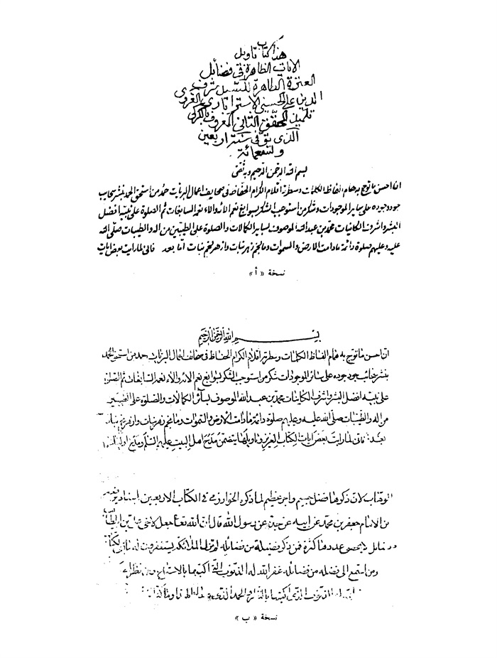 والآن، حيث وفقنا الله بحسن توفيقه وسداده لموالاته وموالاة الطيّبين من أولاده، فلنقل بعده (5): شكرا لله على نعمائه (6) السابغات على من يحبه ويتولاه: