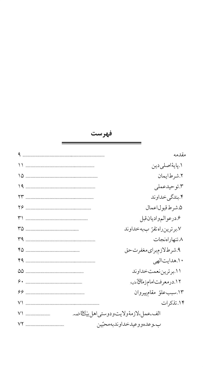 توجه به آيات وروايات نقل شده در فصول گذشته بخوبی می رساند که پس از توحيد ونبوت، فريضه ای واجب تر ومهم تر از معرفت و ولايت اهل بيت عليهم السلام در دين يافت نمی شود وحتی بهره گيری از اعتقاد به توحيد ونبوت نيز مشروط به اين است که فرد، پيرو ولايت ائمه اطهار عليهم السلام باشد وامام زمان خود را بشناسد. اعمال وعبادات او نيز به همين شرط پذيرفته شده، نجات اخروی او نيز مشروط به همين شرط می باشد.لذا زيبنده است که