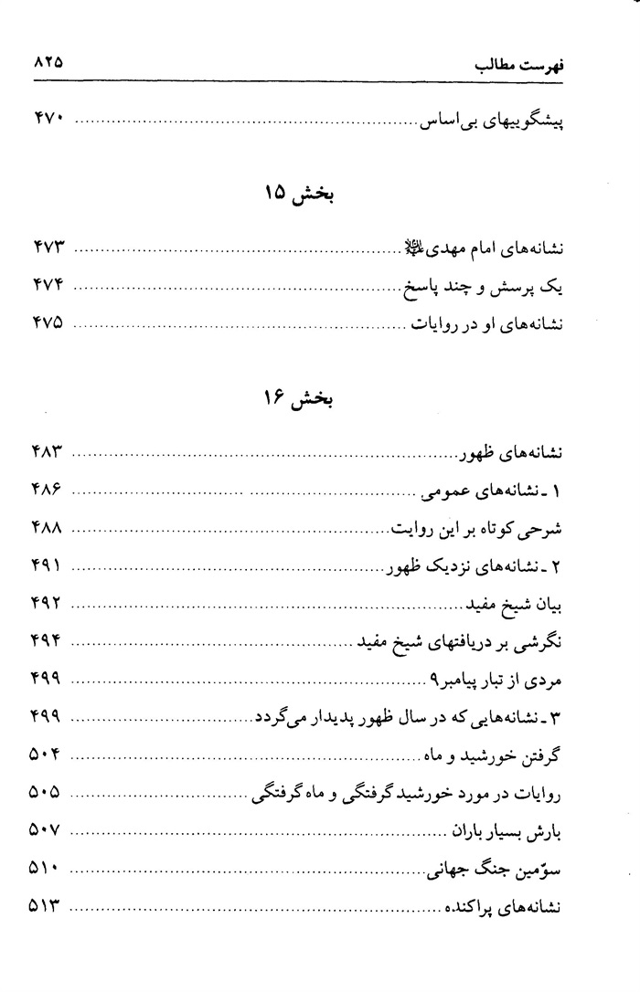 در پایان بحث یادآوری می گردد که: در نگارش این کتاب، نگارنده به صدها روایت در مورد امام مهدی (علیه السلام) ومسایل مربوط به آن حضرت در مجموعه های حدیثی دست یافتم، اما از آوردن نام آنها گذشتم. این مطلب نه بخاطر تردید در صحت روایات بوده بلکه ضرورتی در آوردن آنها ندیدم چرا که برخی از آنها با برخی دیگر که از نظر سند ودلالت صحیح وقوی بود، ناسازگاری می نمود. وبرخی پذیرش وتحملش، برای برخی از مردم مشکل است ومفهوم آن جز با مقدمات بسیاری روشن نمی شود. از این جهت بهتر آن دیدم که آنها را به کسانی که دست به نگارش مجموعه ها وفرهنگهای حدیثی می زنند، واگذارم.