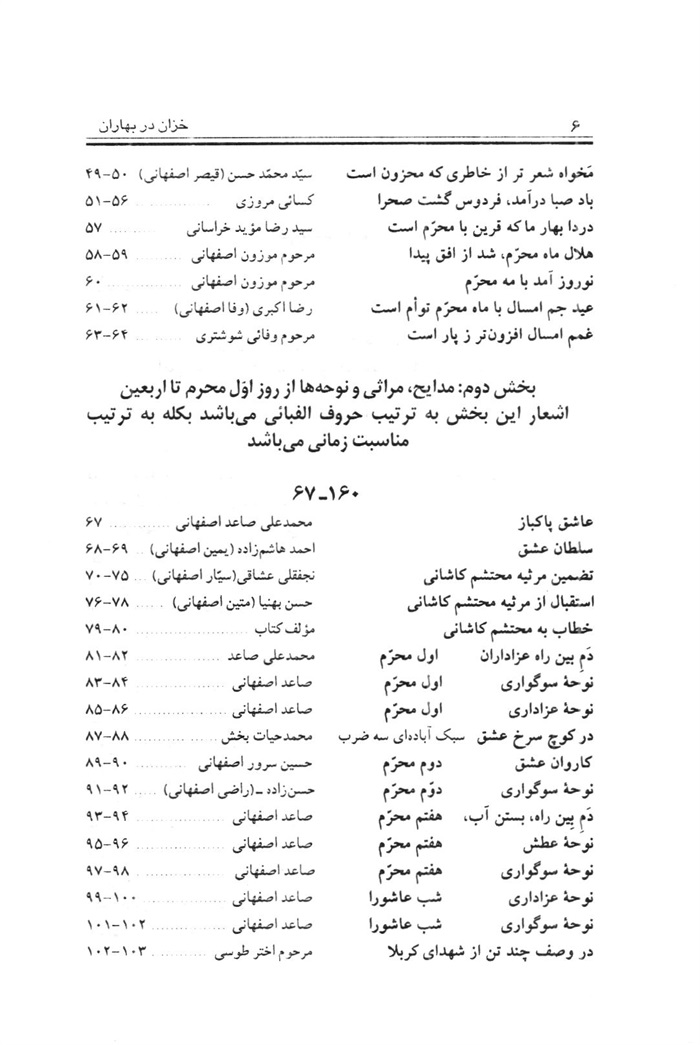 این مجموعه در دو بخش تنظیم شده است: بخش نخست، اشعاری درباره تقارن نوروز و محرّم می باشد، كه به ترتیب حروف الفبایی نام شاعران آورده شده است. بخش دوم، تازه ترین اشعار مدائح و مراثی و نوحه ها از روز اوّل ماه محرّم تا روز اربعین به ترتیب زمانی منظّم گردیده است. امیدوارم مورد قبول ولی نعمت و مولایم حضرت سیّدالشهداء - صَلَواتُ اللَّه عَلَیه - قرار گیرد.