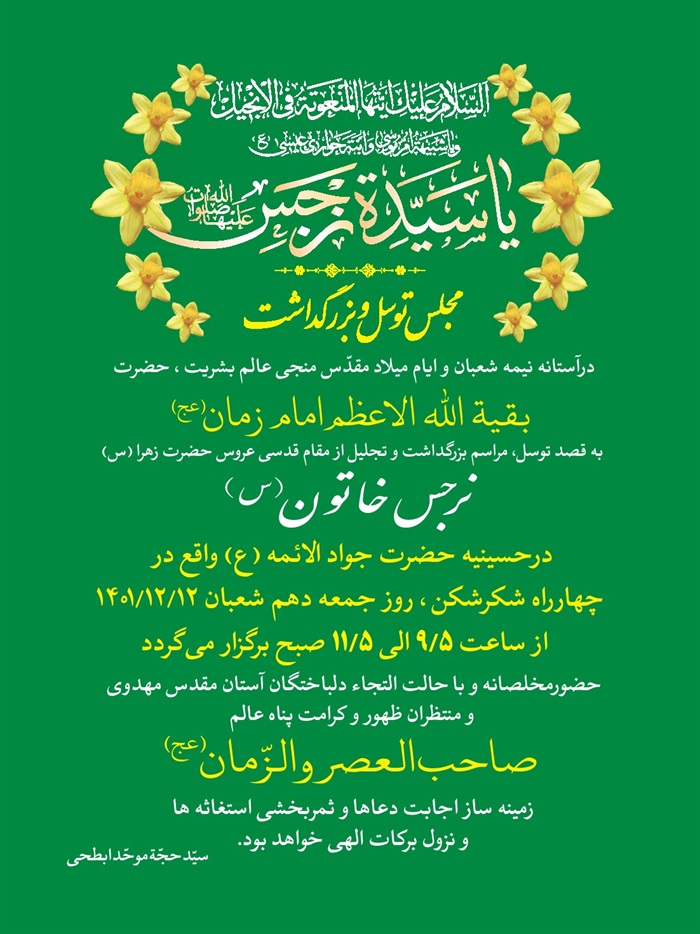 بعد ذكریٰ ولادة سیدة نساء العالمین الصدّیقة الزهراء(سلام الله علیها) التي وافقت العشرین من شهر جمادی الثانیة من سنة 1444ق، ولأسباب عدیدة تحدّث سماحة آیة اللّٰه السیّد حجّت الموحّد الأبطحي(دام ظله)، بخصوص السیّدة نرجس(سلام الله علیها) وضرورة إقامة المراسم لإجلالها وإکرامها، وكان له التأكید الكبیر _ في مجالس وجلسات عدیدة _ علیٰ تلامذته وناشطي الفعّالیات الدینیة.