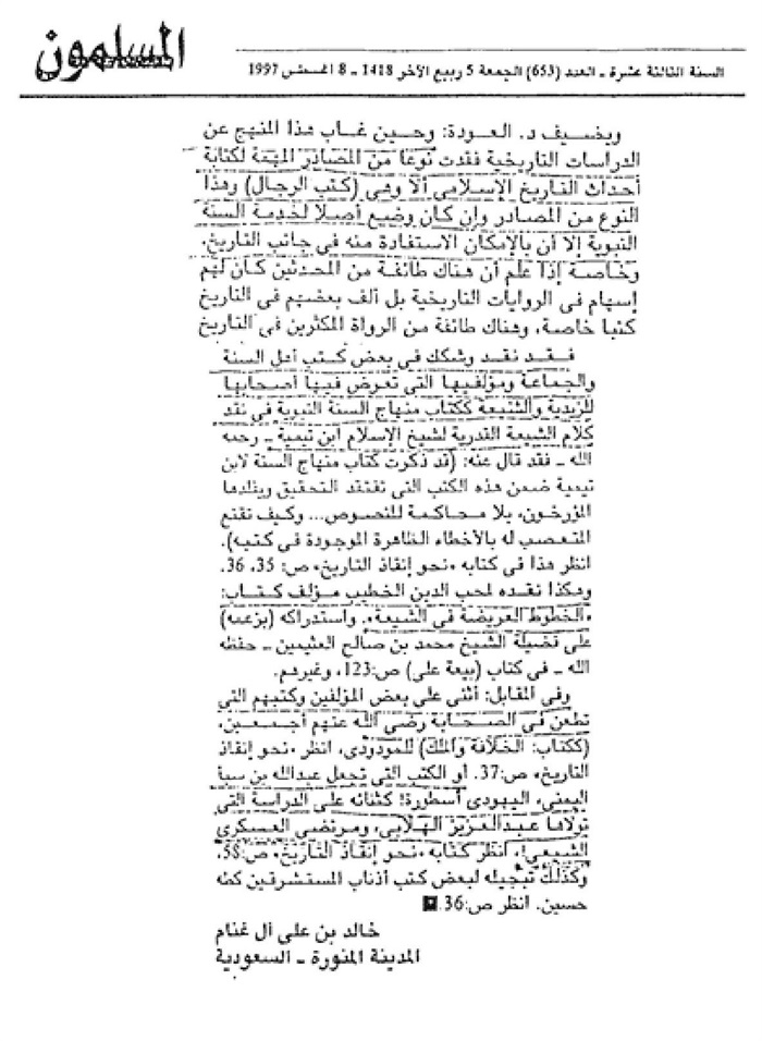 وقد یأخذ علیّ الدکتور اننی نقلت بعض النتائج التی توصل إلیها بعض الباحثین کالهلابی والعسکری ! وهذا غیر صحیح لأننی رجعت للمصادر نفسها وتأکدت من تلک النتائج بنفسی وخالفتهما فی بعض النتائج التی لم أعلن عنها وأضفت مما لو أجده عندهما مع امتنانی لصاحب السبق فی سبقه الی تلک النتائج أو بعضها لکن لنتأکد من المعلومات بأنفسنا ونضیف غیر مقلدین لیأتی بعدنا من یضیف ویبنی علی نتائجنا وهکذا. (2)