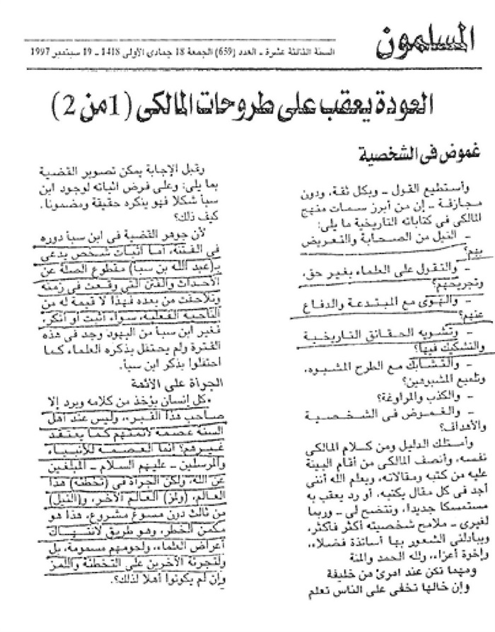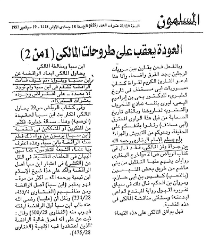 هذه وأمثالها قضایا أثارها المالکی بطوعه واختیاره - ولیست تهما - تنسب إلیه فهو ملزم بالإجابه عنها ، والاعتذار عن ما کتبه فیها ، أما المراوغه فلیست من شیم الرجال ، وهی مکشوفه للأجیال !