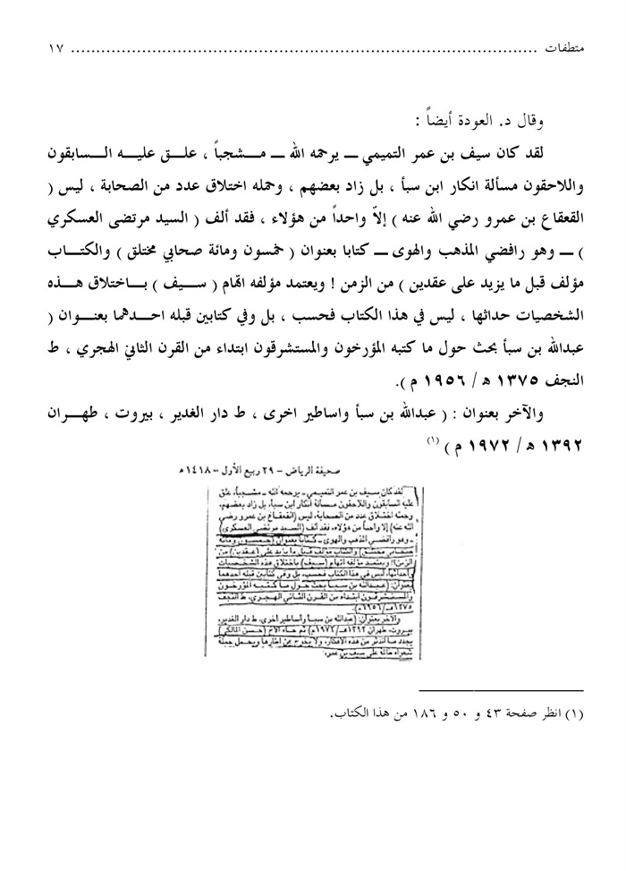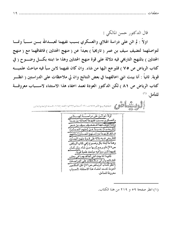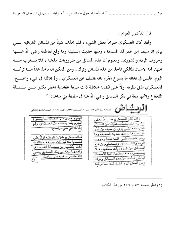 اولاً : لم اثن علی دراسه الهلابی والعسکری بسبب نفیهما لعبدالله بن سبأ ونما لتواصلهما لتضیف سیف بن عمر ( تاریخیاً ) بعیداً عن ( منهج المحدثین ) فاتفاقهما مع ( منهج المحدثین ) بالمنهج التاریخی فیه دلاله علی قوه منهج المحدثین وهذا ما ابنته بکل وضوح ( فی کتاب الریاض ص 75 ) فلیرجع الیها من شاء. وان کان نفیهما لابن سبأ فیه مباحث علمیه قویه. ثانیاً : أنا بینت اننی اخالفهما فی بعض النتائج وان لی ملاحظات علی الدراستین ( انظر کتاب الریاض ص 81 ) لکن الدکتور العوده تعمد اخفاء هذا الاستثناء لاسباب معروفه للتأمل. (1)