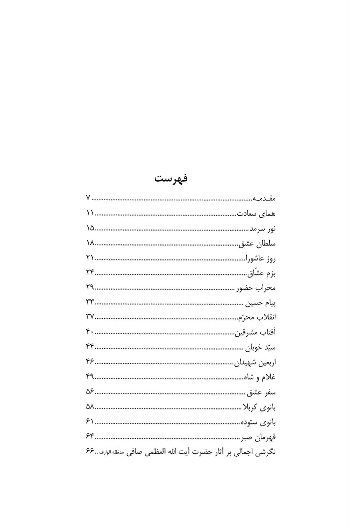 مجموعۀ اى كه پيش روى داريد از همين سنخ اشعار و از همان گروه شاعران ياد شده است. اين اشعار از متفكر معاصر و فقيه پر مايه حضرت آيت الله العظمى آقاى حاج شيخ لطف الله صافى است كه اشك و خون را با هم عجين كرده و احساس و الهام را در هم آميخته اند و اينك به مناسبت ايام عاشورا تقديم دل دادگان امام حسين عليه السلام مى شود.
