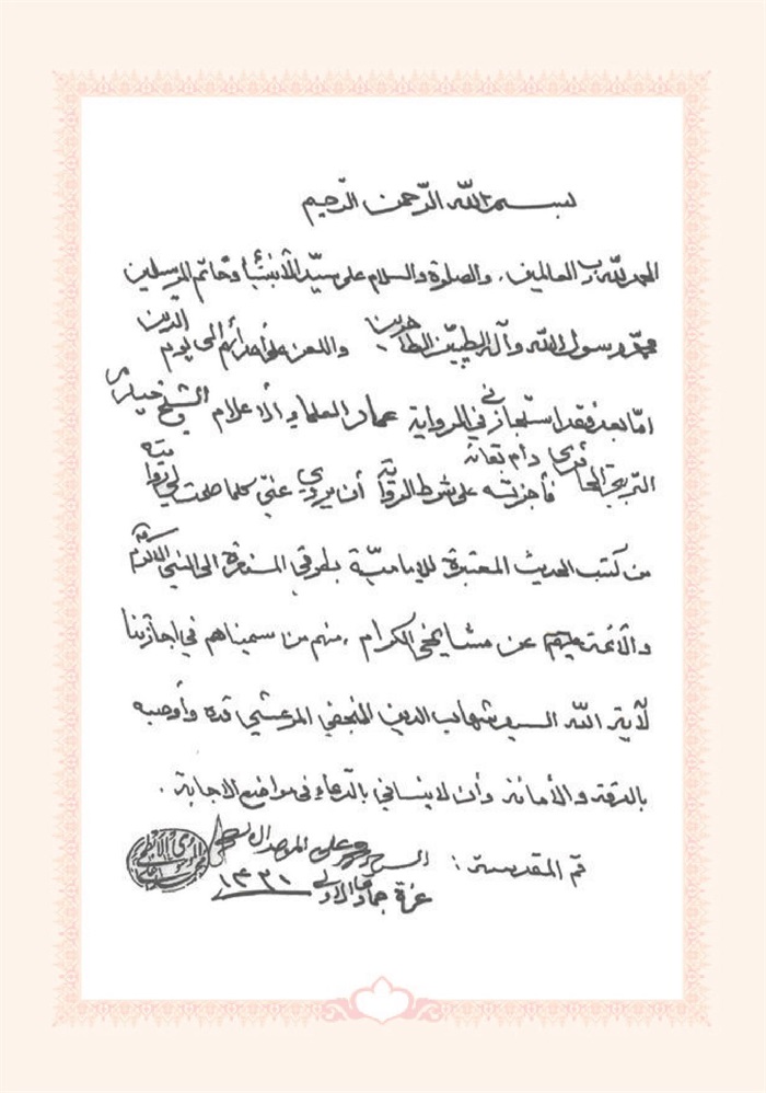 و نيز روايت مي كنم از سيّد استاد آيةالله موحّد ابطحي قدس سره از آيةالله مرعشي نجفي قدس سرهما به طرق ايشان از كتب حديث ائمّه از اهل بيت عصمت و طهارت علیهم السلام.