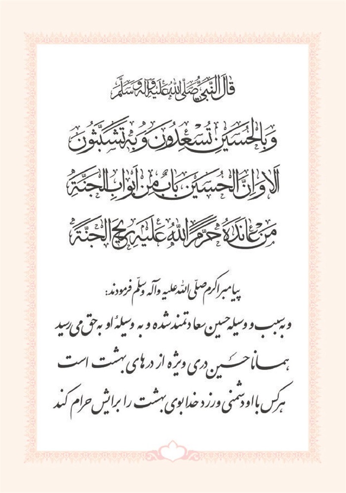 و قال رسول الله صلی الله علیه وآله وسلم : ... وَ الَّذِي بَعَثَنِي بِالْحَقِّ نَبِيّاً إنَّ الْحُسَيْنَ بْنَ عَلِيٍّ فِي السَّمَاءِ أكْبَرُ مِنْهُ فِي الْأرْضِ، فَإنَّهُ لَمَكْتُوبٌ عَنْ يَمِينِ عَرْشِ اللَّهِ: مِصْبَاحُ هُدًى وَ سَفِينَةُ نَجَاةٍ، وَ إمَامُ غَيْرِ وَهْنٍ (خَيْرٍ وَ يُمْنٍ) وَ عِزٍّ وَ فَخْرٍ وَ بَحْرُ عِلْمٍ وَ ذُخْرٍ... .(4)