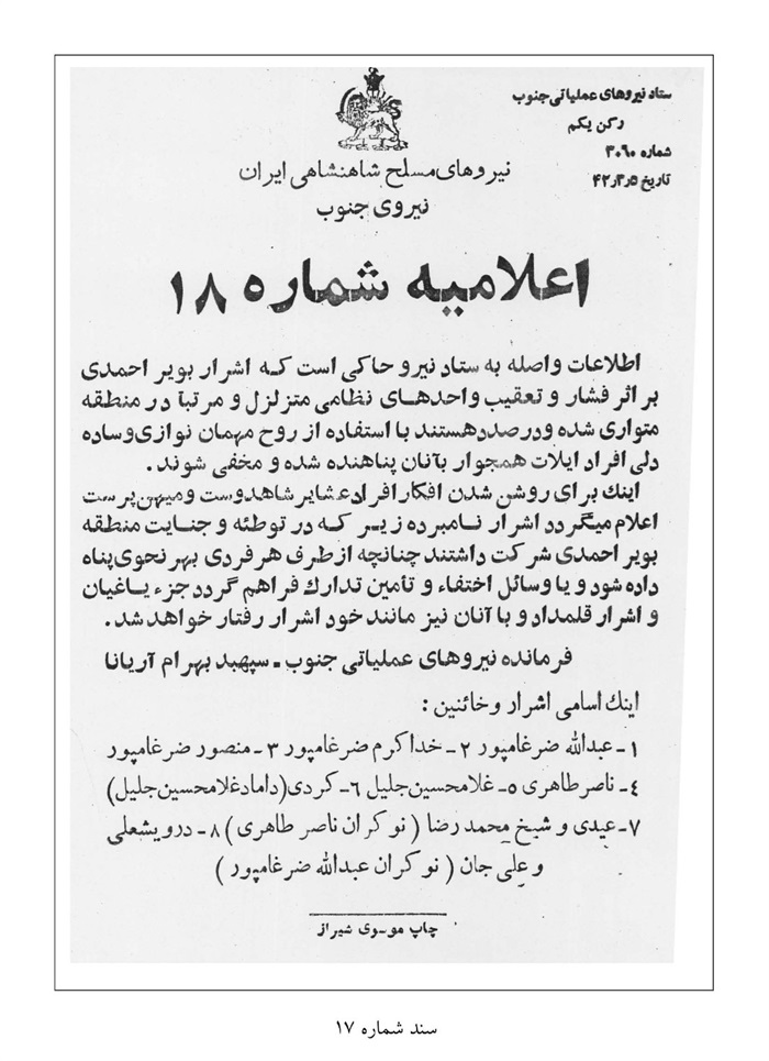 اعلامیة دیگر، در خرداد 1342 انتشار یافته و اوضاع نابسامان شهرها و استان های مختلف کشور _ از جمله فارس _ را تبیین کرده است.(5)