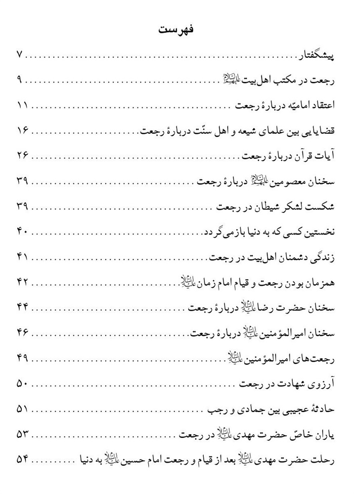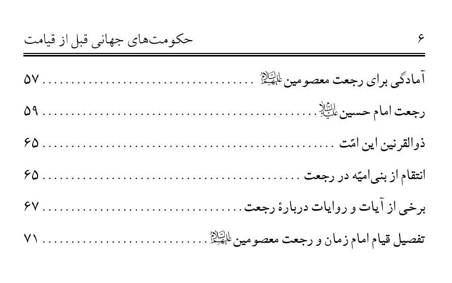 کتابی که مشاهده می کنید، چکیده و خلاصه نظرات علمای بزرگوار شیعه و متون روایاتی است که درباره رجعت معصومین علیهم السلام به دنیا و تشکیل دولت های جهانی اسلامی پس از دولت جهانی حضرت بقیّة اللّه علیه السلام بیان شده است.