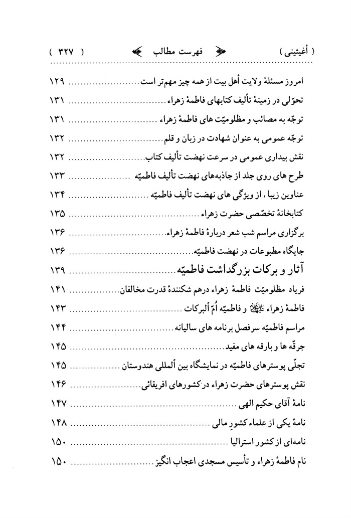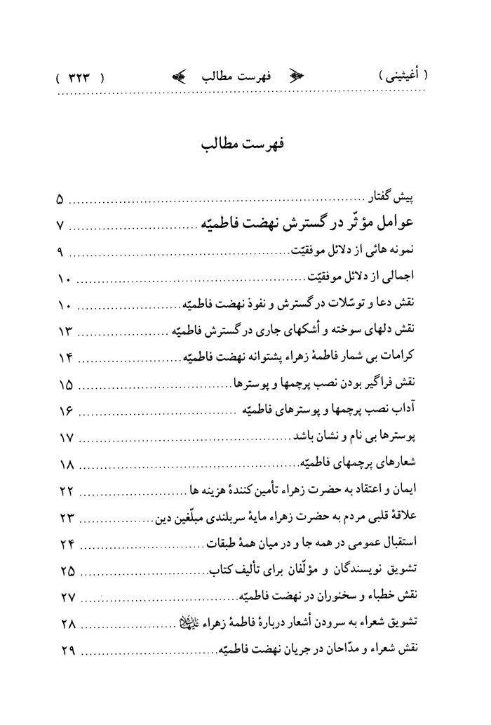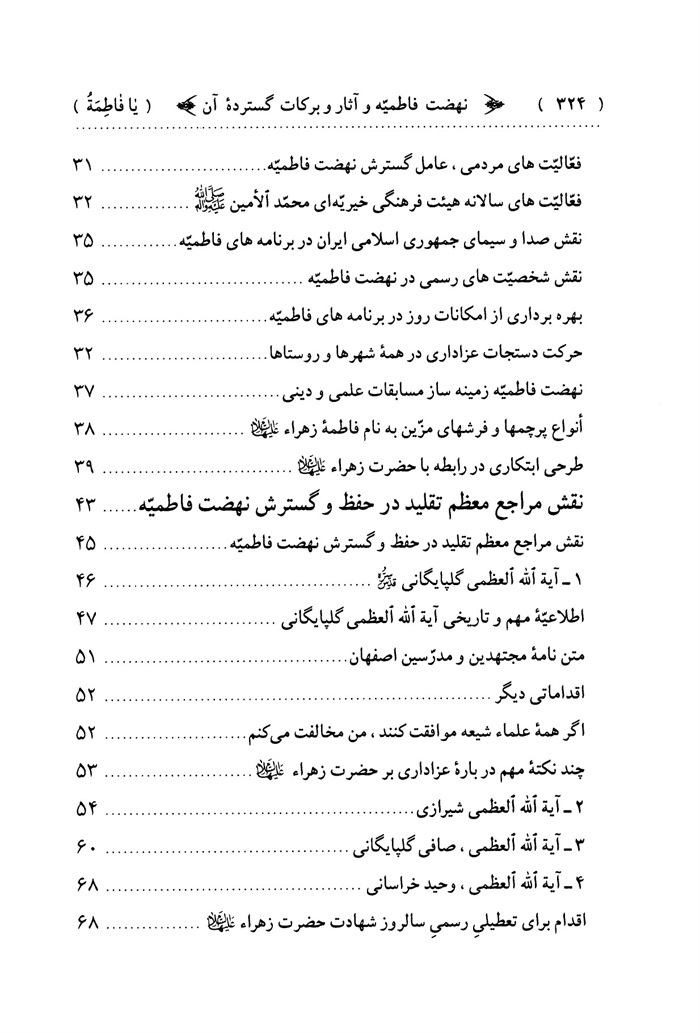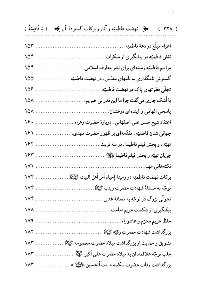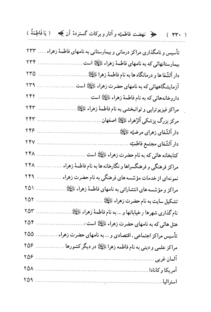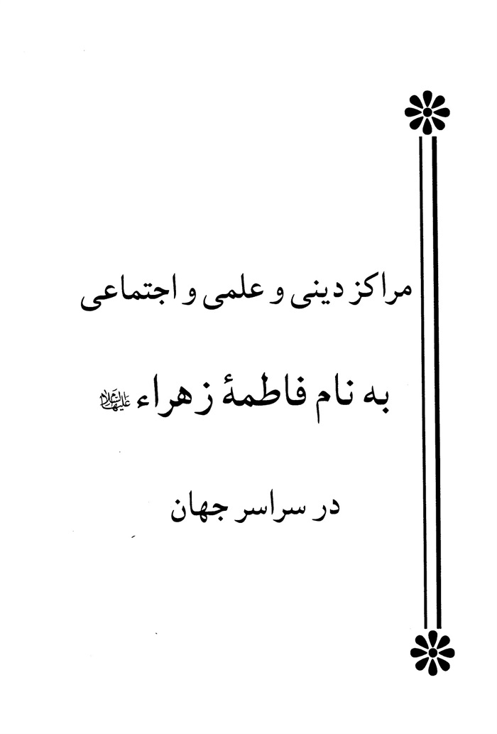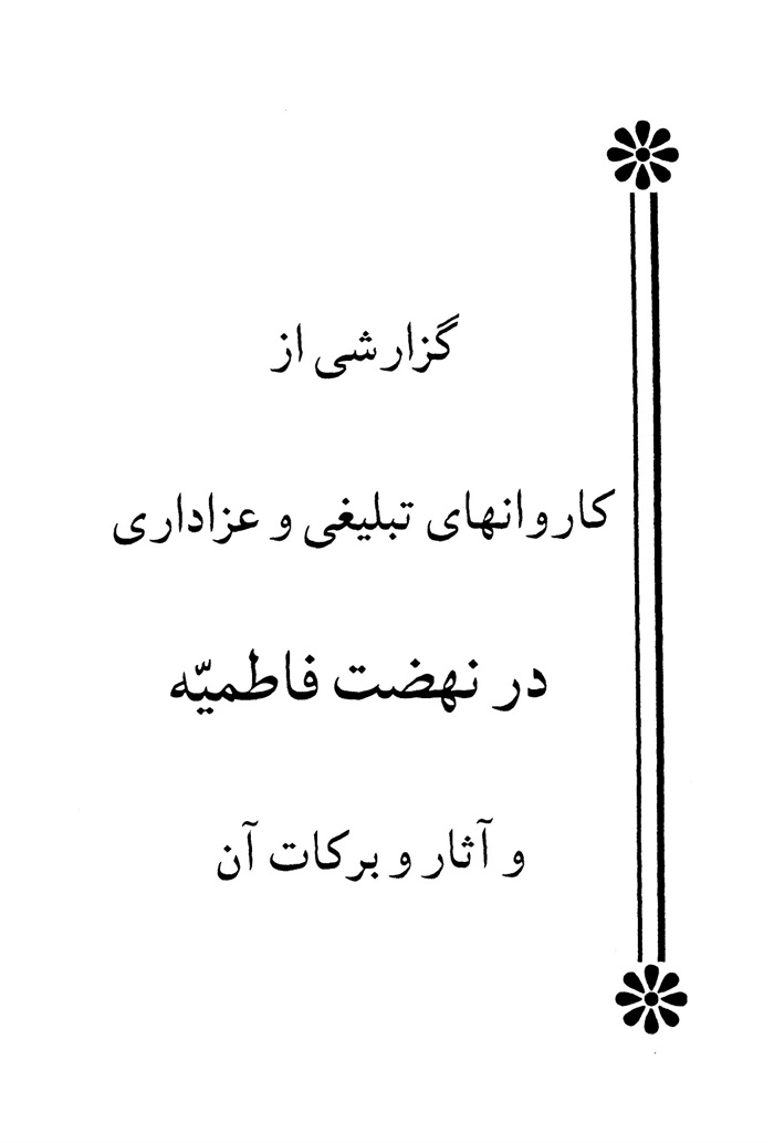 درباره برنامه های متنوع و گسترده علاقمندان به فاطمه زهراء علیها السلام (در شهرها و روستاها و کشورهای گوناگون) گوشه هایی از اثار بزرگ نهضت فاطمیه را دسته بندی نموده و عرضه نمایم و البته می دانم که ذکر نام هر مسجد یا حسینیه یا دارالشفاء یا خیریه ای که به نام فاطمه زهراء علیها السلام نامیده شده اشاره به یک سلسله عرض ادب ها و اخلاص ها همت ها و فداکاری هاست و هیچ کس نمی تواند با آمار و ارقام و با الفاظ و عبارات آن همه ارزش مادی و معنوی را تشریح نماید. حرکت هر دسته ای و یا برگزاری هر مجلسی و یا تاسیس هر بنیان دینی و خیری در برگیرنده چه بسیار از کششها و کوششها همت ها و خدمت ها است و تالیف هر کتاب یا مقاله ای و سرودن هر مدیحه یا مرثیه ای نشات گرفته از چه ذوقها و قریحه ها ابتکارها و خلاقیت ها تدبیرها و طراحی ها است و این همه قابل بیان و تشریح کامل نمی باشد ولی: