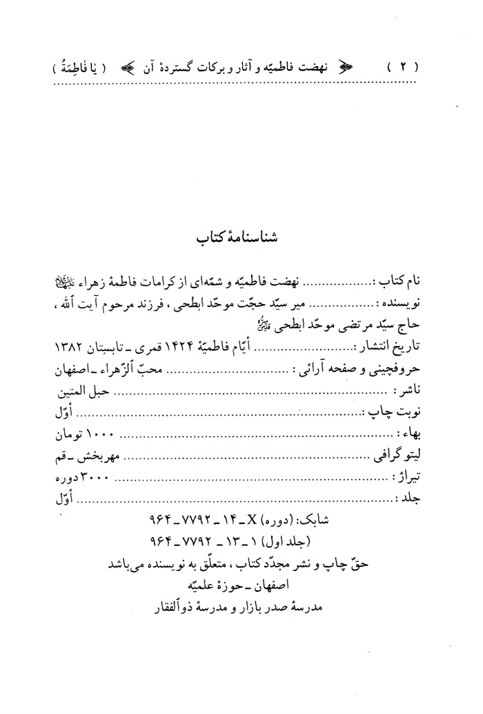 عنوان و نام پدیدآور : نهضت فاطمیه و شمه ای از کرامات فاطمه زهرا علیهاالسلام/ تالیف سید حجت موحد ابطحی