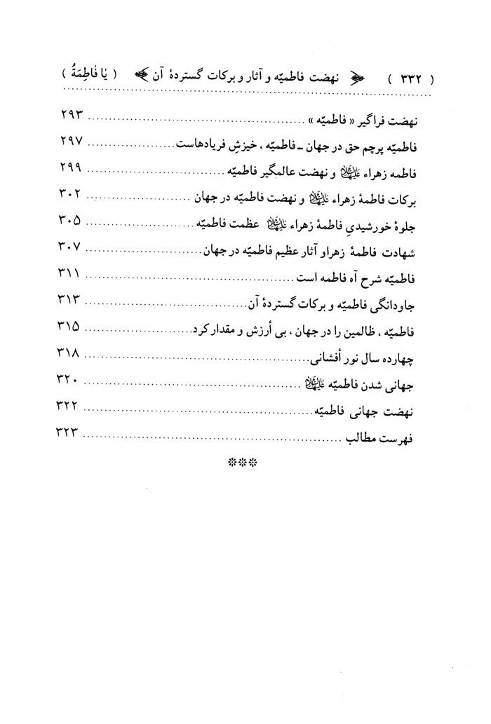 این مجموعه به محضر مقدس رسول خدا صلی اللّٰه علیه و آله که به یاد مصائب فاطمه زهراء سلام اللّٰه علیها اشک غم باریدند به محضر مقدس امیرالمومنین علیه السلام که در شهادت فاطمه زهرا سلام اللّٰه علیها آرزوی مرگ نمودند به محضر مقدس همه امامان معصوم علیهم السلام که د رمصیبت مادرشان ناله ها سر دادند به محضر مقدس حضرت بقیه اللّٰه علیه السلام که در مصیبت زهرای مرضیه دل شکسته اند و به همه امامزادگان، زعماء و پرچمداران دین، و همه دلسوختگان و غمزدگان آن مظلومه، و به هر کس که با فکر و اندیشه، قلم و بیان، مقام و رتبه، هنر و ابتکار، همت و خدمت خود، به آستان مقدس حضرت زهراء علیها السلام عرض ادب می نماید.