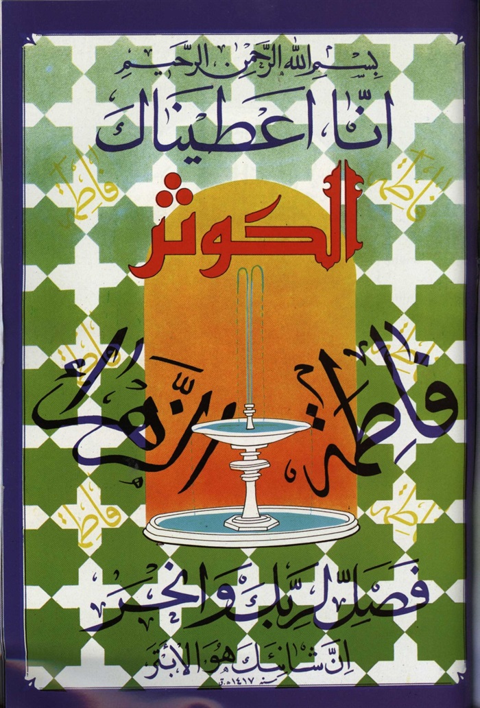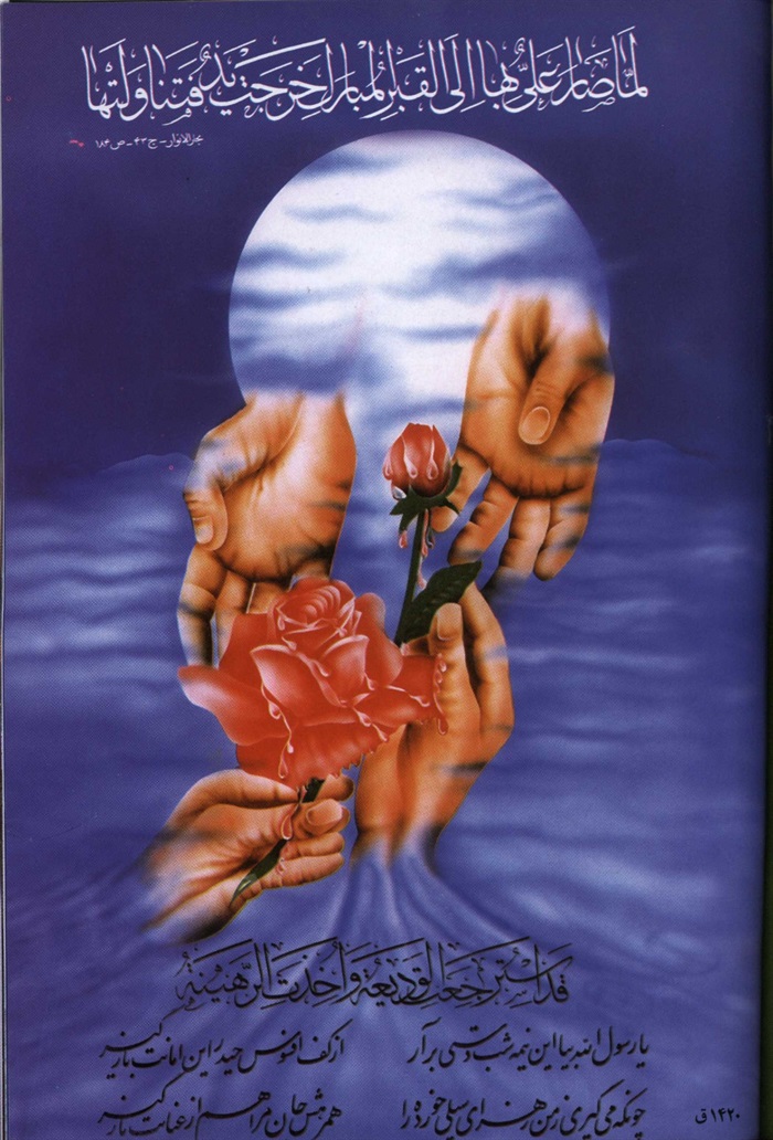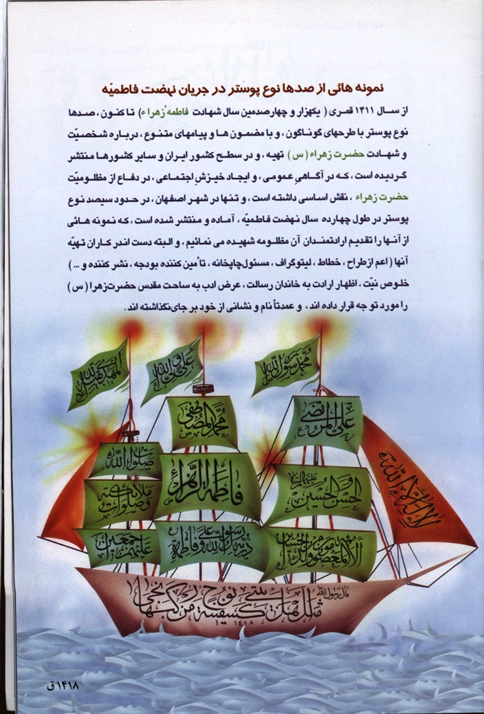 حالات و روحیات معنوی ویژه ای است و با خلوص نیت خدمات خود را به محضر آن حضرت عرضه می دارد در یک رویای صادقه (که همراه با نشانه های صدق و حقیقت بود) شرفیاب محضر صدیقه طاهره علیها السلام گردید و آن بزرگوار پس از آنکه پوسترها را ملاحظه فرمودند و یکی یکی آنها را مورد لطف و نظر عنایت خود قرار دادند کلامی فرمودند که مضمونش این بود که پای پوسترها اسم و عنوانی نباشد و در اثر این عنایت و دستور از آن سال تاکنون تمامی پوسترها و پرچم هایی که در اشکال و طرح های گوناگون و فراوان و گسترده در تمامی شهرها و روستاها نشر و ارشال گردیده و حتی به خارج از کشور فرستاده شده بدون اسم و عنوان می باشد و از شگفتی های این عنایت و راهنمایی نورانی این است که تاثیر تبلیغی و برکات معنوی این نوع پرچم ها و پوسترها فوق العاده است و بازتاب انتشار آنها بسیار وسیع و تاثیرش در دلها بسیار عمیق می باشد و در طول دوازده سالی که این راهنمایی نورانی و ولائی مورد توجه و عمل قرار گرفته آثار و برکات بسیار زیادی ظاهر گردیده و مکررا از ناحیه صاحب نظران و عموم مردم با ایمان شگفتی آثار این برنامه جالب مورد تاکید و تایید قرار گرفته و برای خودمان هم به شکل قطعی و حتمی و عینی در آمده است.