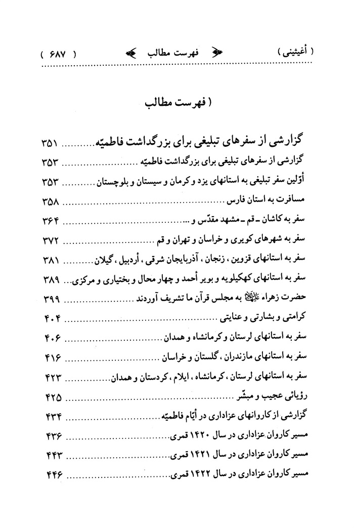 وقتی بیدار شدم و به فکر افتادم ، گلی که هفت سال است در زندگیم روئیده چیست ؟ مروری بر برنامه های گذشته زندگیم نمودم ، ملاحظه کردم که شروع اقدام گسترده ام دربارۀ حضرت زهراء سلام اللّٰه علیها همراهی در مسافرت دسته جمعی ، در کاروان تبلیغی فاطمیّه بوده است ، که تاریخ آن در صفحۀ أوّل مفاتیح الجنان که به عنوان یادگار سفر تبلیغی فاطمیّه اهداء شده بود ، ضبط گردیده ، و خدای را شکر کردم که با هشدارها و راهنمائی های مکرّر ( به احترام فاطمۀ زهراء سلام اللّٰه علیها) از لغزشهای خطرناک محفوظم داشته اند .