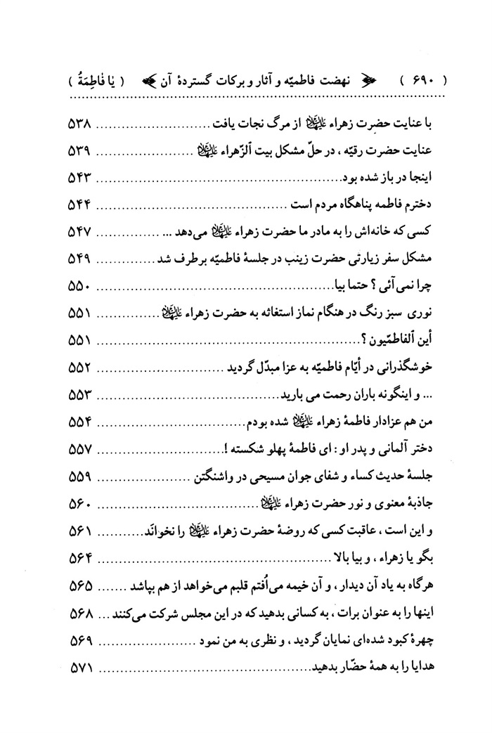 و نمونه این جمله ها و عبارات را در اظهارات دانشگاهیان حوزویان بازاریان و اداریان و عموم مردم (اعم از زن و مرد) فراوان به صورت کتبی و شفاهی دیده و یا شنیده ایم (1) و این نویسنده کمترین مکررا و به نحو قطع و یقین لطف و بزرگواری فاطمه زهرا علیها السلام و پیامبر اکرم صلی اللّٰه علیه و اله و ائمه معصومین علیهم السلام و بالاخص حضرت امام علی بن موسی الرضا علیه السلام و حضرت بقیه اللّٰه الاعظم عجل اللّٰه فرجه و نیز حضرت ام البنین علیها السلام و حضرت اباالفضل علیه السلام را احساس کرده ام و مورد لطف و عنایت آن بزرگواران قرار گرفته ام که اگر عنایات آنان نمی بود این همه موفقیت به دست نمی آمد و با وجود دشمنان فراوان و سنگ اندازان معاند که با زبان و قلم و تمام ابزارهای مادی دشمنی می کنند ادامه فعالیت بسیار مشکل بود و نتیجه های بسیار کمتری حاصل می گردید.