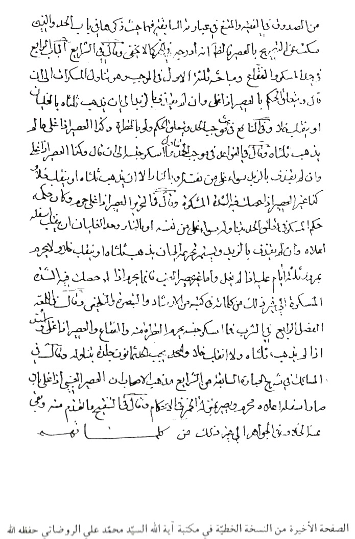 فمنها رسالة کبیرة مستقلّة، بیّن فیها مصنّفها قدس سره أحکام الخمر و غیرها من سائر المسکرات، والعصیر العنبیّ والتمریّ والزبیبیّ .