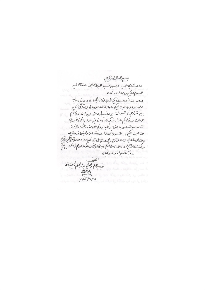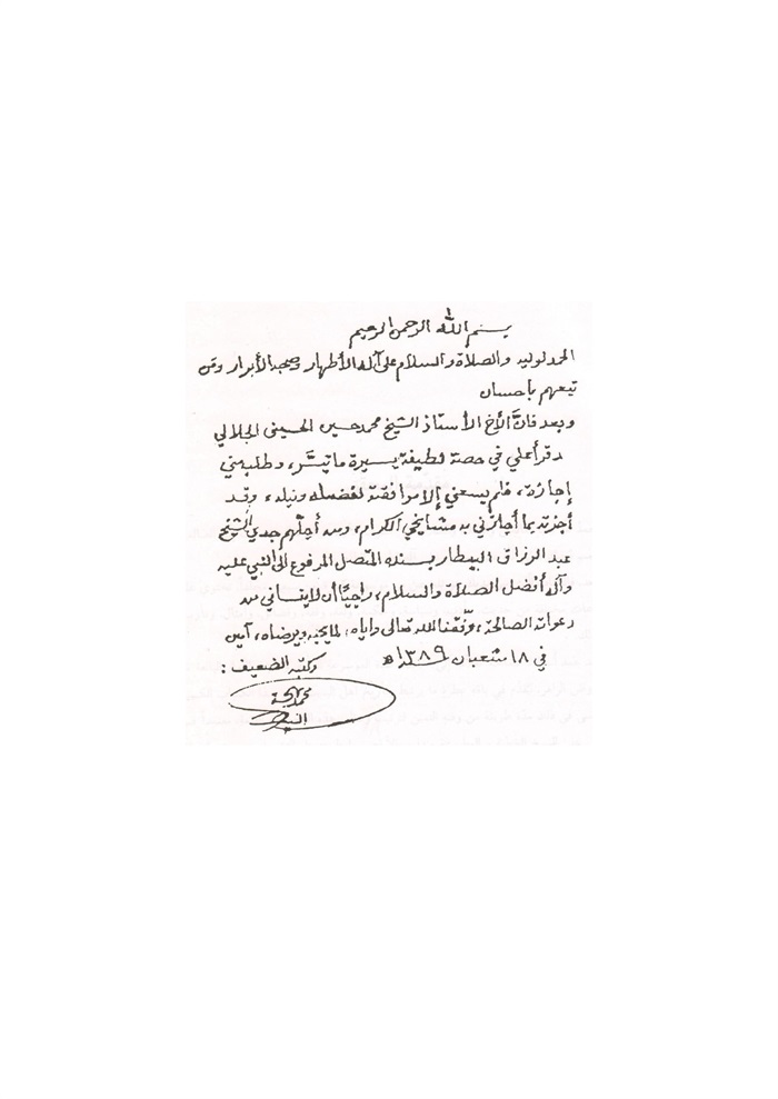 وبعد یقول الفقیر إلی رحمة ربه الغنیّ حسین حلبیان: استجزت من سماحة العلامة السیّد محمّدحسین الحسینی الجلالی یوم 18 شوال المکرم 1434 مکاتبة بذکر بعض مشایخی(1) وبعض آثاری وبعد إرسال وجیزة فی فضائل سیّدتنا الزهراء سلام الله