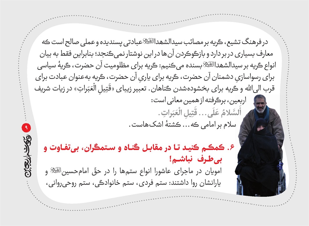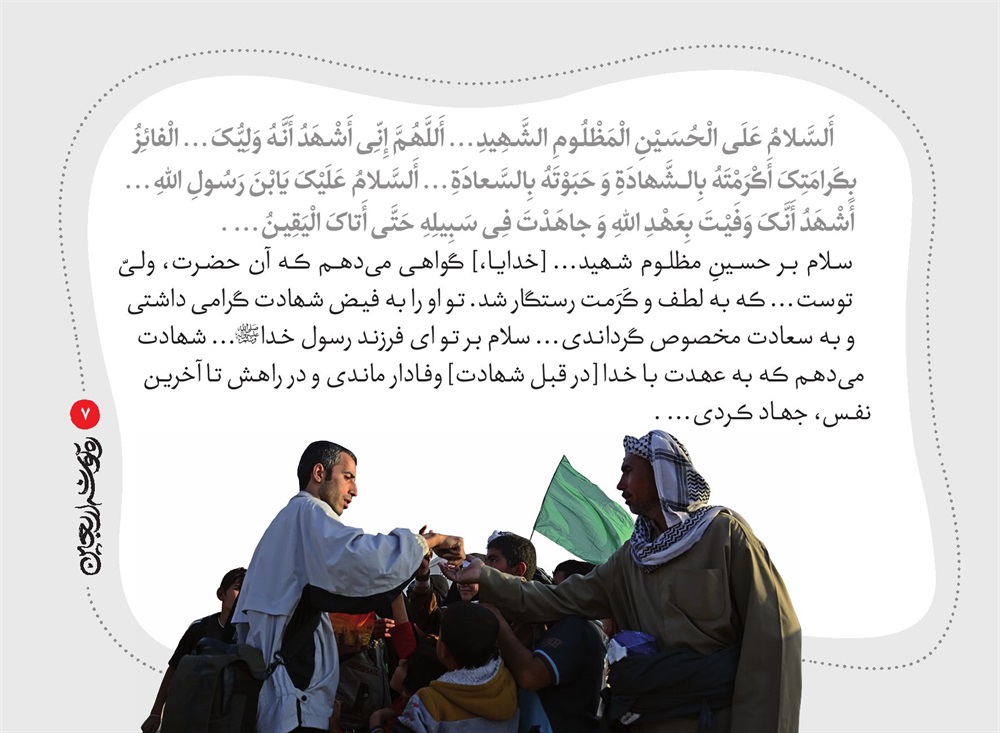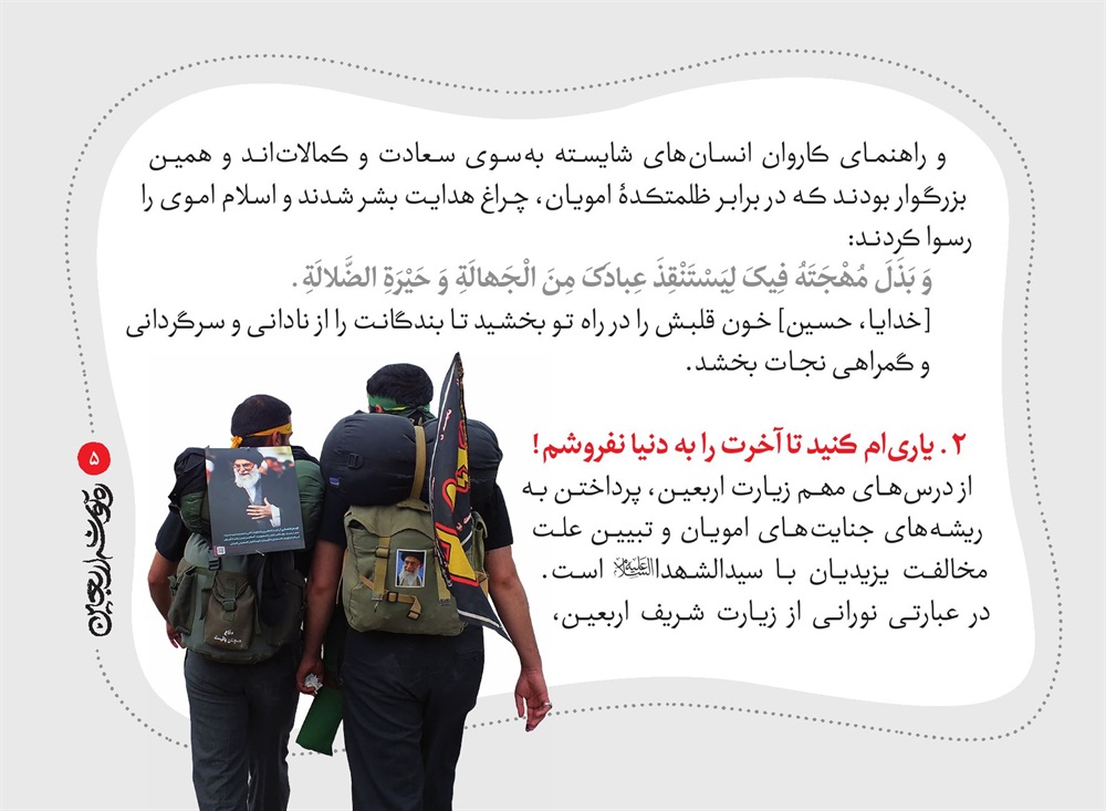 5. همچنان که با تربیت جهادی و پذیرش زحمت، برای رضای خدا و عشق به سیدالشهدا علیه السلام رنج سفر را بر خود هموار کردید، در این مسیر و نیز پس از سفر، برای اجرای احکام دین و آرمان های اهل بیت علیهم السلام بکوشید.