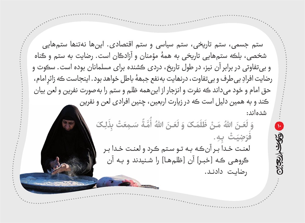 رضایت به ستم و گناه و بی تفاوتی در برابر آن نیز، در طول تاریخ، دردی کشنده برای مسلمانان بوده است. سکوت و رضایت افرادِ بی طرف و بی تفاوت، درنهایت به نفع جبهۀ باطل خواهد بود. اینجاست که زائرِ امام، حق خود و امام می داند که نفرت و انزجار از این همه ظلم و ستم را به صورت نفرین و لعن بیان کند و به همین دلیل است که در زیارت اربعین، چنین افرادی لعن و نفرین شده اند: