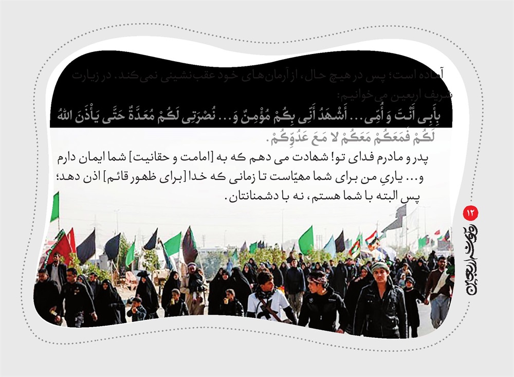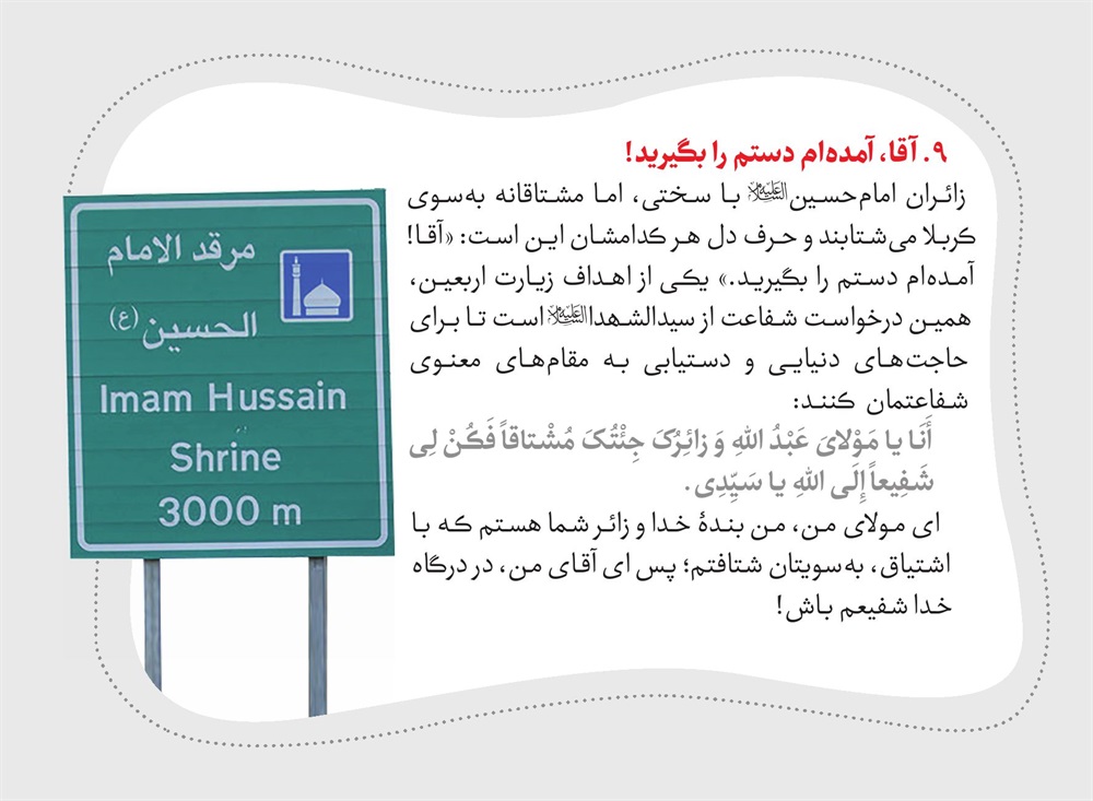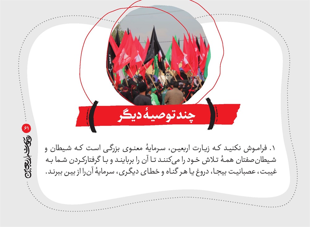 1. فراموش نکنید که زیارت اربعین، سرمایۀ معنوی بزرگی است که شیطان و شیطان صفتان همۀ تلاش خود را برای ربودنش می کنند تا با گرفتارکردن شما به غیبت، عصبانیت بیجا، دروغ یا هر گناه و خطای دیگری، سرمایۀ شما را از بین ببرند.