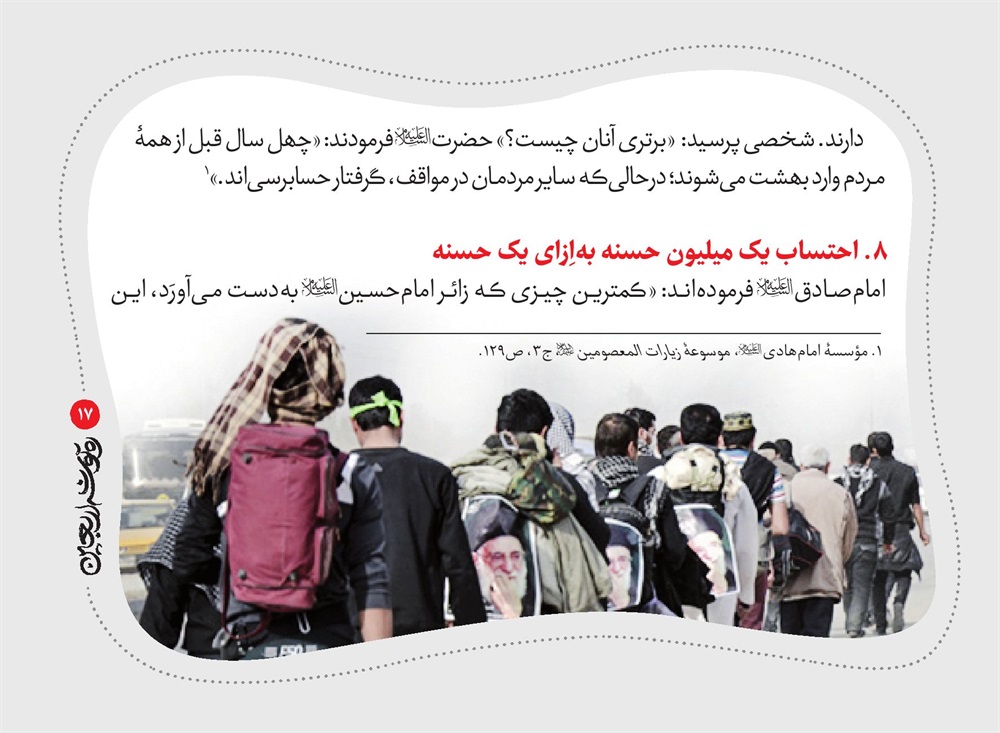 4. از این پس، بهتر است به رسم ادب و تشکر برای توفیق زیارت و نیز تجدید میثاق با امام، هر روز یا حدّاقل هر شب جمعه، زیارت امام حسین علیه السلام از راه دور را فراموش نکنید.