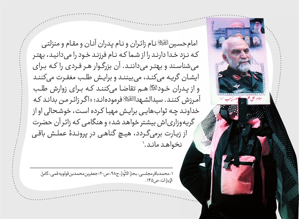امام حسین علیه السلام نام زائران و نام پدران آنان و مقام و منزلتی که نزد خدا دارند را از شما که نام فرزند خود را می دانید، بهتر می شناسد و بهتر می داند. آن بزرگوار هر فردی را که برایش گریه می کند، می بیند و برایش طلب مغفرت می کند و از پدران خود علیهم السلام هم تقاضا می کند که برای زوارش طلب آمرزش کنند. سیدالشهدا علیه السلام فرموده اند: «اگر زائر من بداند که خداوند چه ثواب هایی برایش مهیا کرده است، خوشحالی او از گریه وزاری اش بیشتر خواهد شد» و هنگامی که زائر آن حضرت از زیارت برمی گردد، هیچ گناهی در پروندۀ عملش باقی نخواهد ماند.(1)
