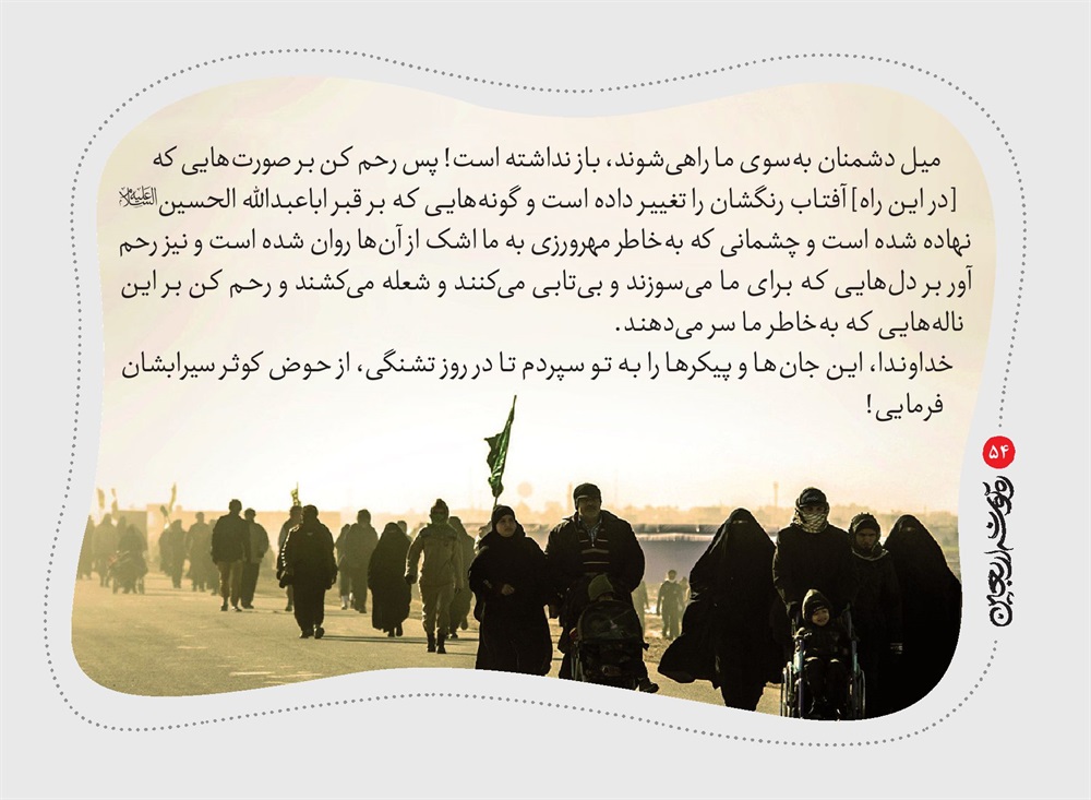 ...اغْفِرْ لِی وَ لِإِخْوَانِی وَ زُوّارِ قَبْرِ أَبِی عَبْدِ اللهِ الْحُسَیْنِ بْنِ عَلِیٍّ علیه السلام الَّذِینَ أَنْفَقُوا أَمْوالَهُمْ وَ أَشْخَصُوا أَبْدانَهُمْ رَغْبَةً فِی بِرِّنا وَ رَجاءً لِما عِنْدَکَ فِی صِلَتِنا وَ سُرُوراً أَدْخَلُوهُ عَلَی نَبِیِّکَ مُحَمَّدٍ صلی الله علیه و آله وسلم وَ إِجابَةً مِنْهُمْ لِأَمْرِنا وَ غَیْظاً أَدْخَلُوهُ عَلَی عَدُوِّنا أَرادُوا بِذَلِکَ رِضْوانَکَ فَکافِهِمْ عَنّا بِالرِّضْوانِ وَ اکْلَأْهُمْ بِاللَّیْلِ وَ النَّهارِ وَ اخْلُفْ عَلَی أَهالِیهِمْ وَ أَوْلادِهِمُ الَّذِینَ خُلِّفُوا بِأَحْسَنِ الْخَلَفِ وَ اصْحَبْهُمْ وَ اکْفِهِمْ شَرَّ کُلِّ جَبّارٍ عَنِیدٍ وَ کُلِّ ضَعِیفٍ مِنْ خَلْقِکَ وَ شَدِیدٍ وَ شَرَّ شَیَاطِینِ الْإِنْسِ وَ الْجِنِّ وَ أَعْطِهِمْ أَفْضَلَ مَا أَمَّلُوا مِنْکَ فِی غُرْبَتِهِمْ عَنْ أَوْطَانِهِمْ وَ مَا آثَرُوا عَلَی أَبْنائِهِمْ وَ أَبْدانِهِمْ وَ أَهالِیهِمْ وَ قَراباتِهِمْ أَللَّهُمَّ إنَّ أَعْداءَنا أَعابُوا عَلَیْهِمْ خُرُوجَهُمْ فَلَمْ یَنْهَهُمْ ذَلِکَ عَنِ النُّهُوضِ وَ الشُّخُوصِ إِلَیْنا خِلافاً عَلَیْهِمْ فَارْحَمْ تِلْکَ الْوُجُوهَ الَّتِی غَیَّرَتْهَا الشَّمْسُ وَ ارْحَمْ تِلْکَ الْخُدُودَ الَّتِی تَقَلَّبَتْ عَلَی قَبْرِ أَبِی عَبْدِ اللهِ الْحُسَیْنِ علیه السلام وَ ارْحَمْ تِلْکَ الْأَعْیُنَ الَّتِی جَرَتْ دُمُوعُها رَحْمَةً لَنا وَ ارْحَمْ تِلْکَ الْقُلُوبَ الَّتِی جَزِعَتْ وَ احْتَرَقَتْ لَنا وَ ارْحَمْ تِلْکَ الصَّرْخَةَ الَّتِی کانَتْ لَنا أَللَّهُمَّ إِنِّی أَسْتَوْدِعُکَ تِلْکَ الْأَنْفُسَ وَ تِلْکَ الْأَبْدانَ حَتَّی تُرَوِّیَهُمْ مِنَ الْحَوْضِ یَوْمَ