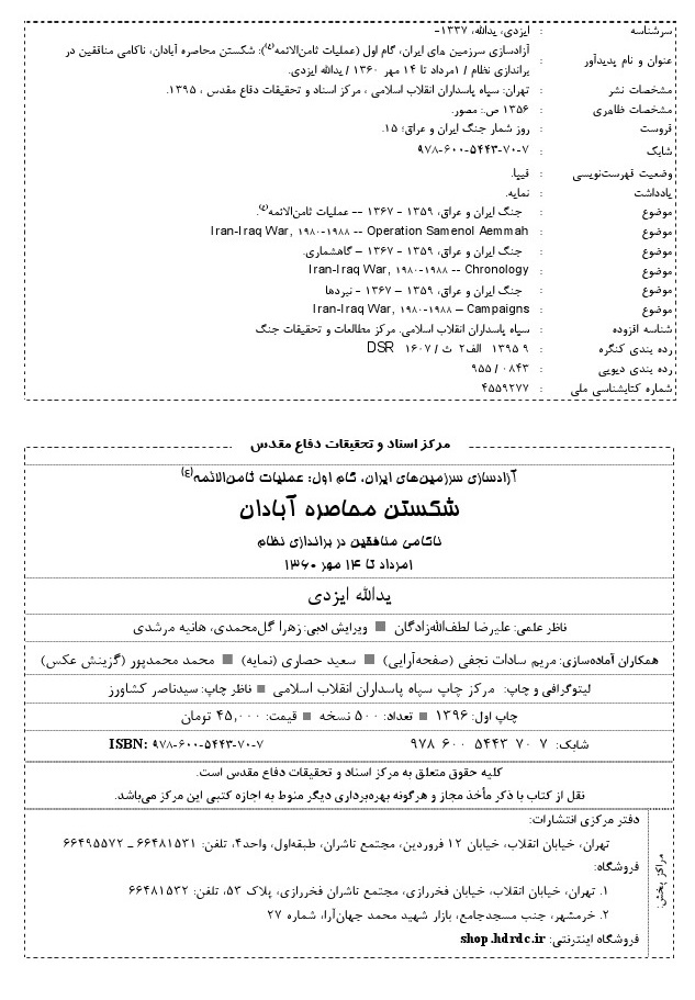 مشخصات نشر : تهران: سپاه پاسداران انقلاب اسلامی، مرکز اسناد و تحقیقات دفاع مقدس، 1396.